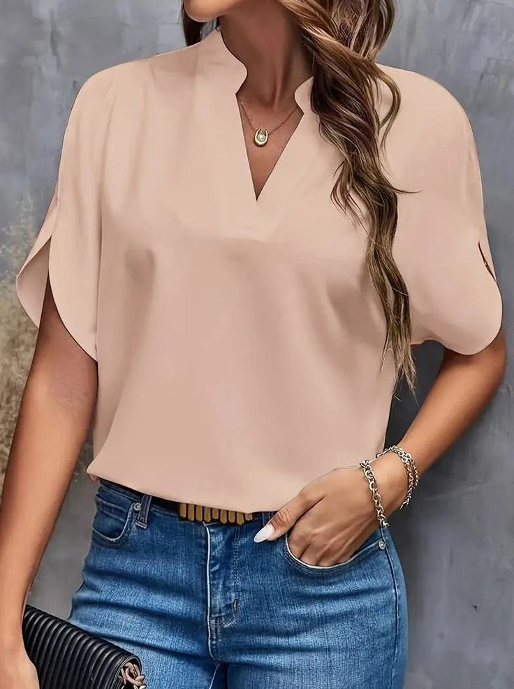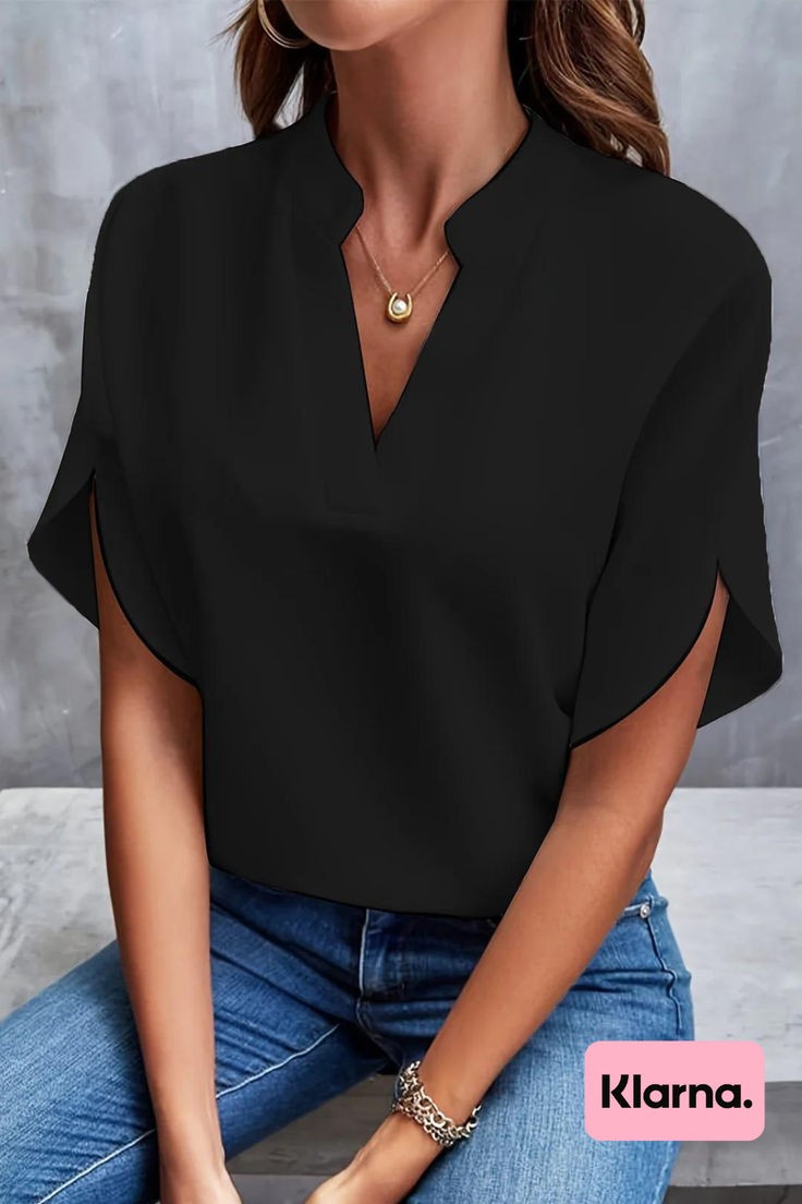 Прямий фасон підходить будь-якому типу фігури, а розрізні рукави надають образу легкість та елегантність. V-подібний виріз підкреслює лінію шиї та створює витончений силует. Блузка легко поєднується з різними елементами гардеробу, що робить її привабливою для покупців.