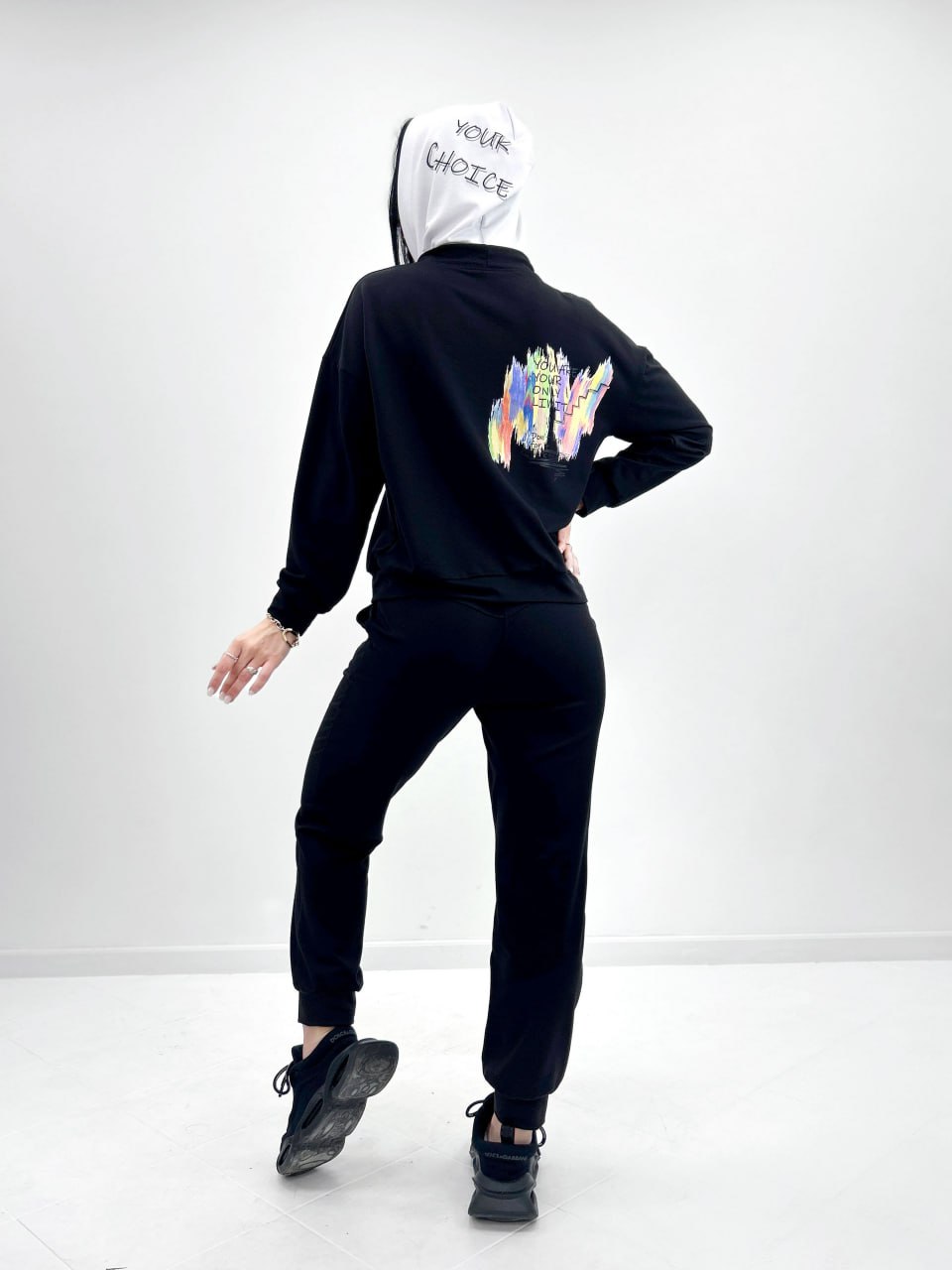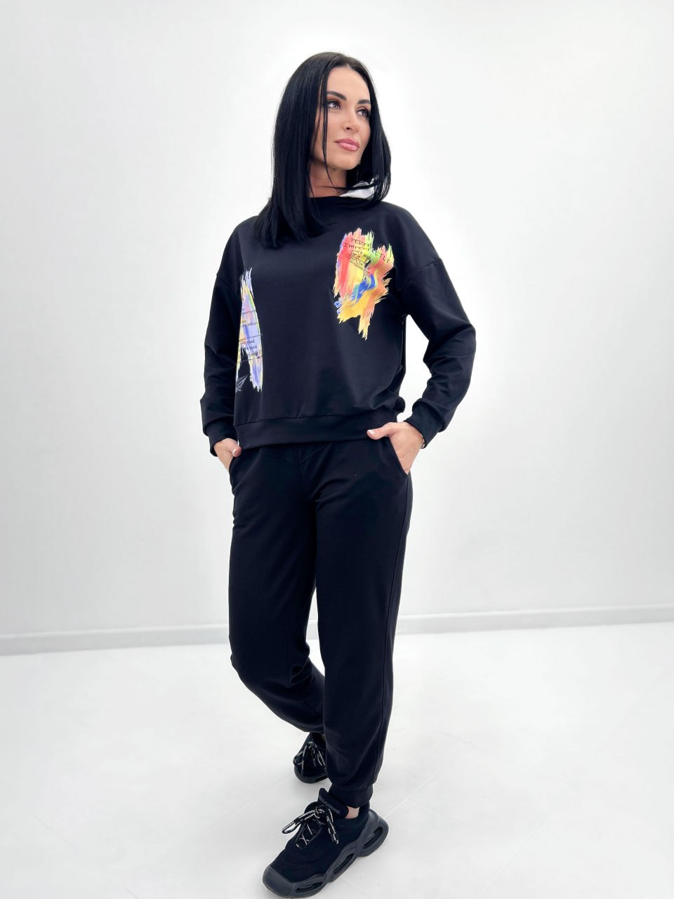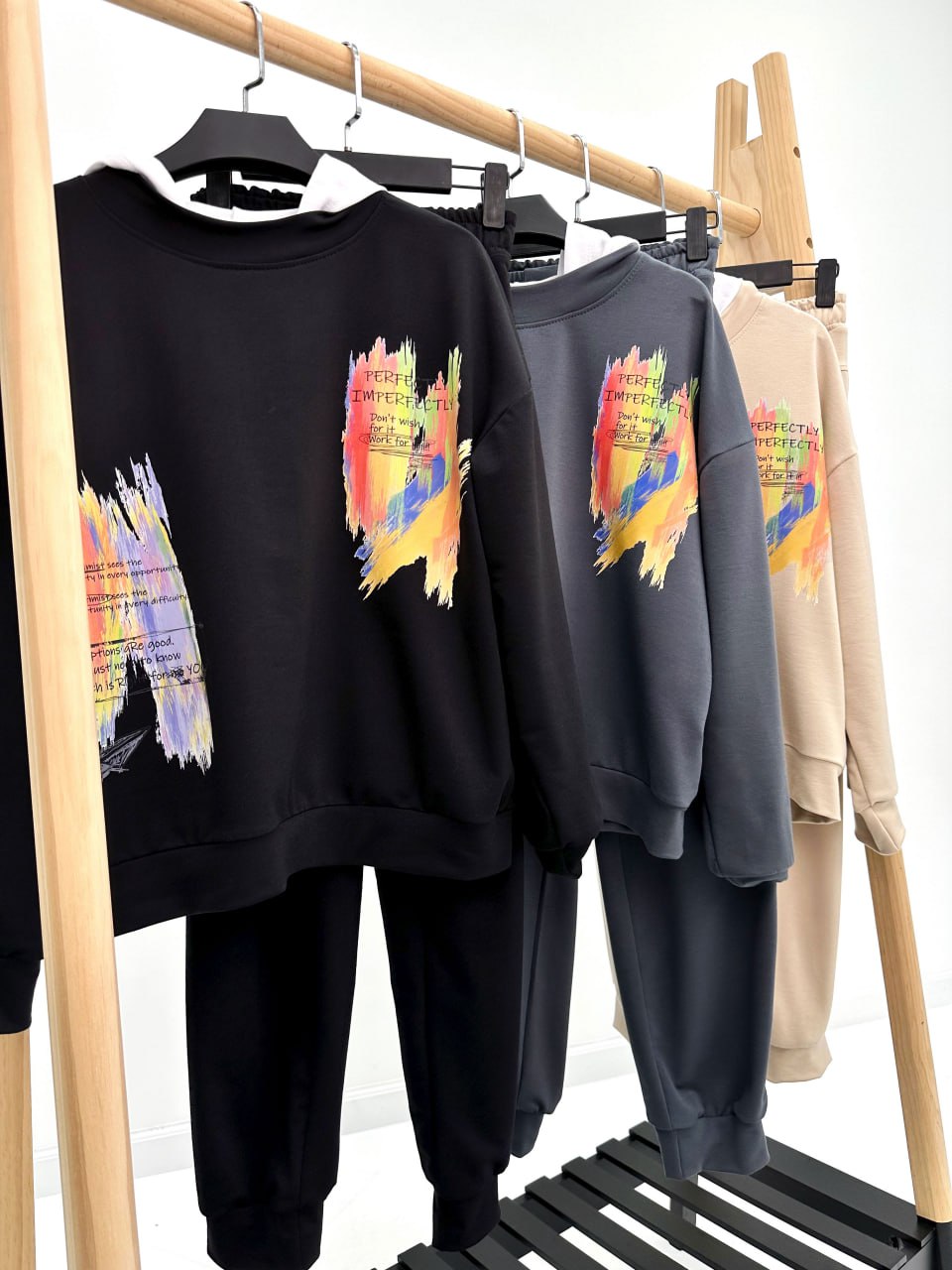 Комплект пошитий у трьох кольорах: ніжно-бежевому, базовому чорному та витонченому графіті. Кожен відтінок гармонійно поєднується з яскравими райдужними малюнками, не зволікаючи і підкреслюючи акценти.