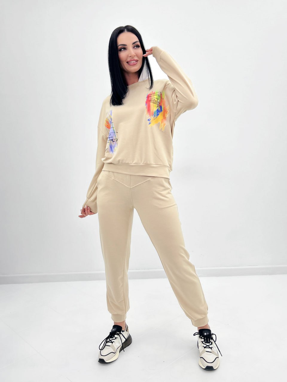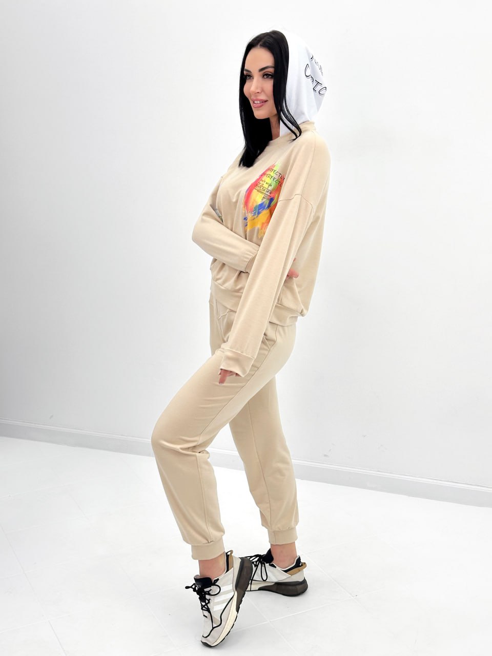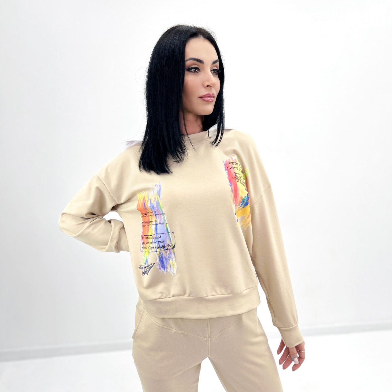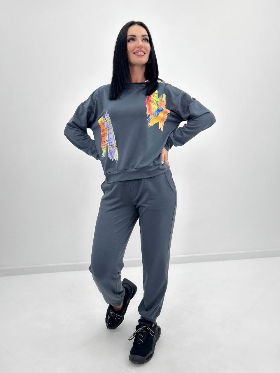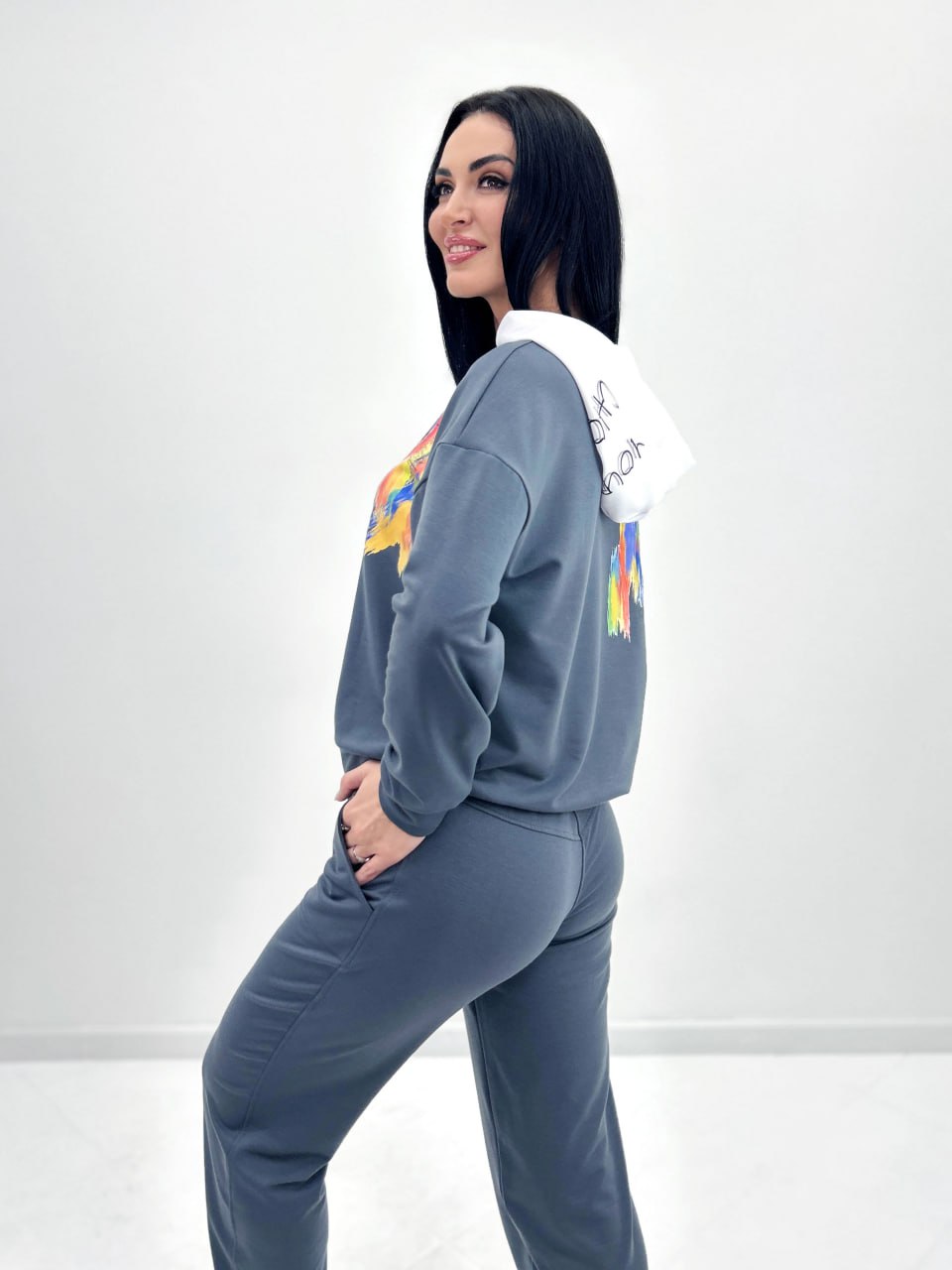 Головний особливість моделі - "Rainbow" - це вільний, але не безформний крій, базова палітра і кілька акцентних деталей: білий капюшон і яскраві принти на верхній частині костюма. Таке ефектне оформлення робить костюм ідеальним варіантом для прогулянкових та повсякденних чином.