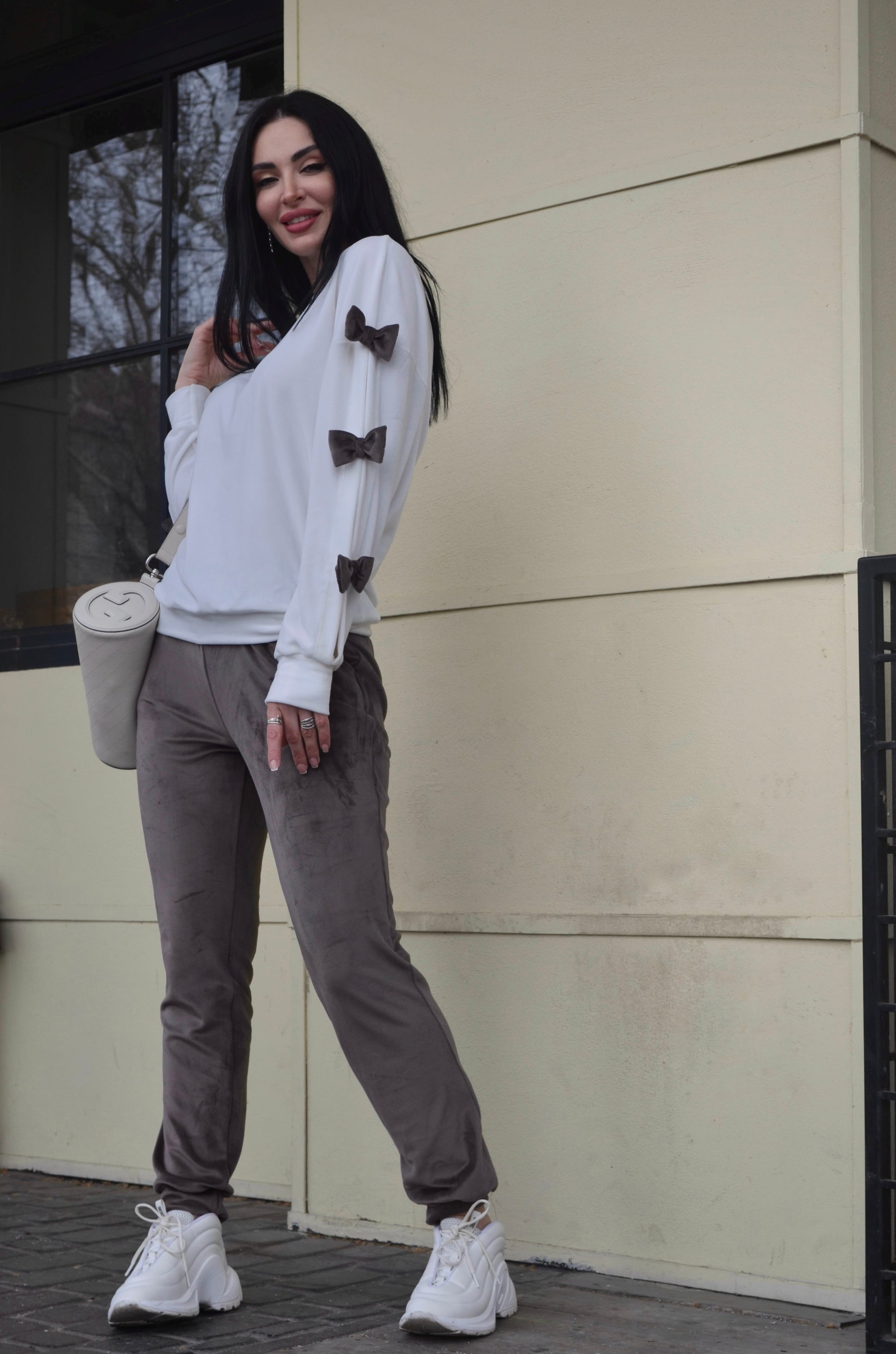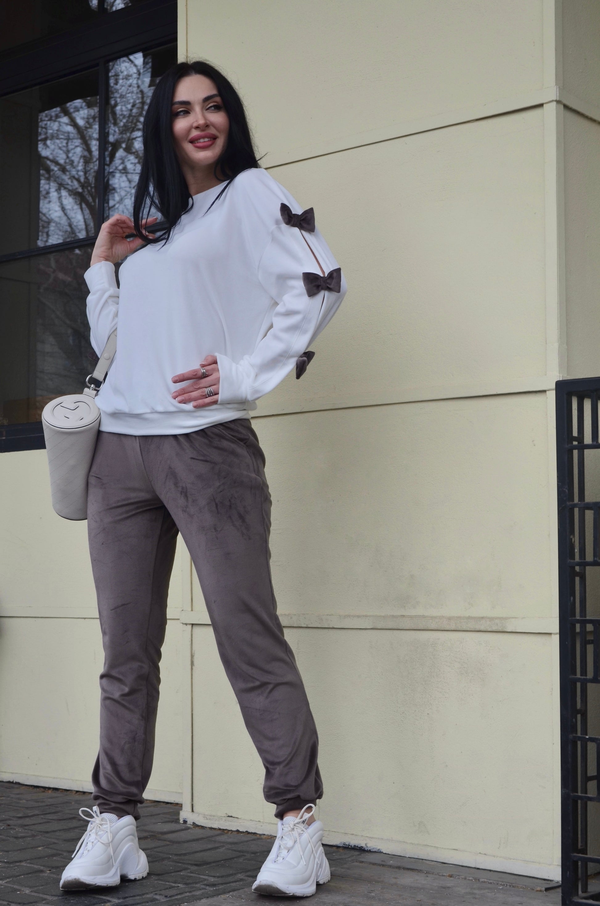 Матеріал костюма – королівський велюр, що відзначається м'якістю, ніжністю та вишуканим блиском. Ця тканина чудово тримає форму, не мнеться та має гарну зносостійкість. Завдяки високій якості матеріалу костюм виглядає дорого та довго зберігає первинний вигляд навіть після численних прань.
