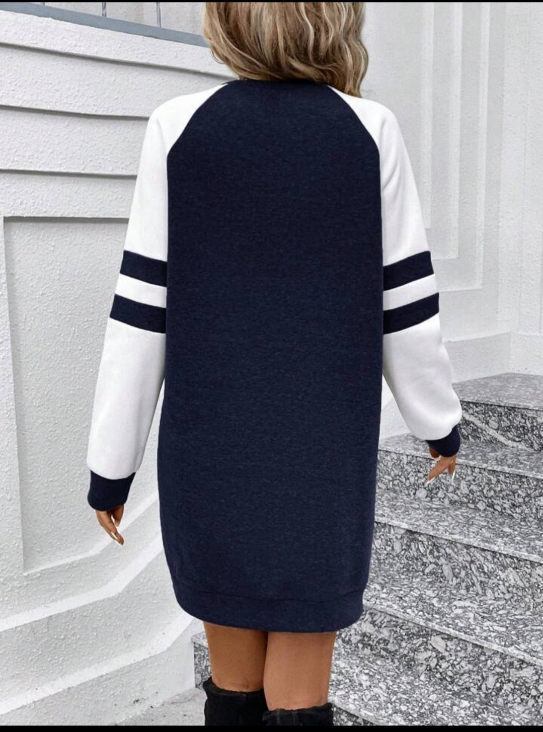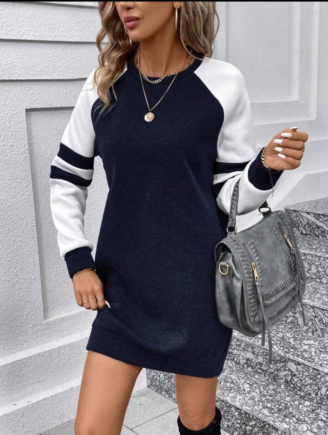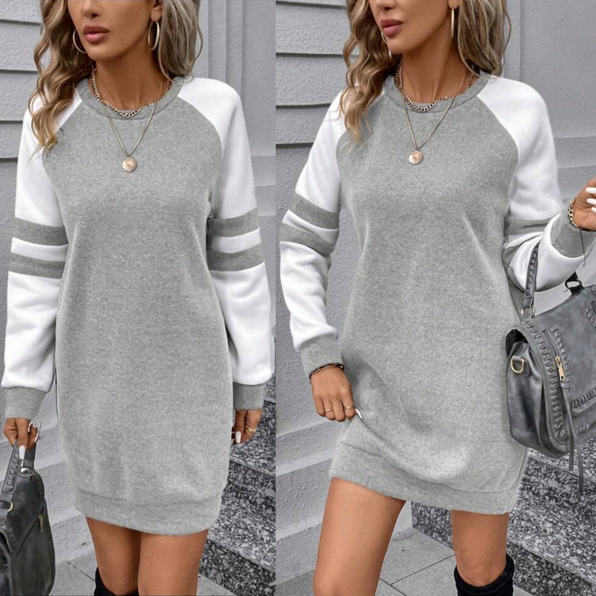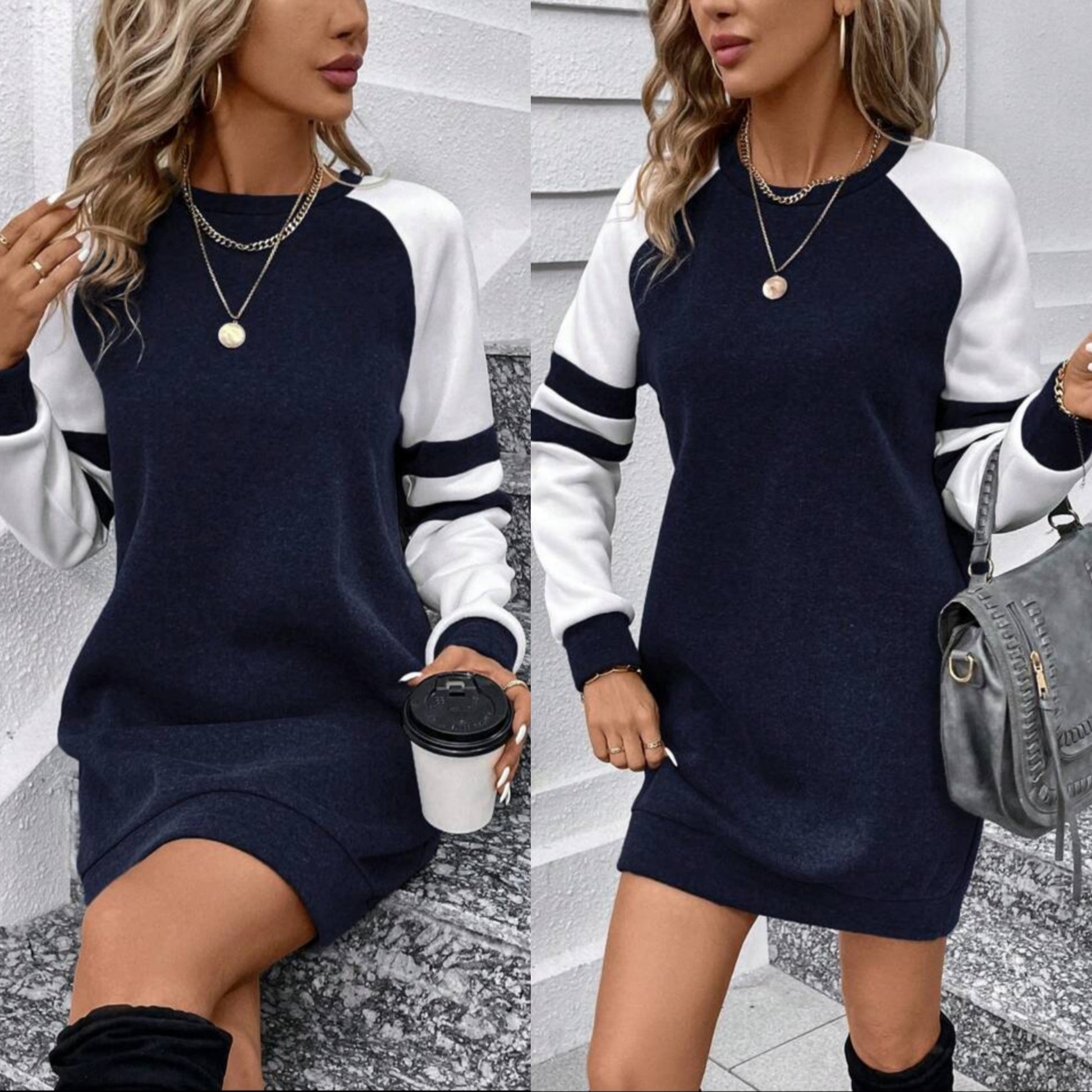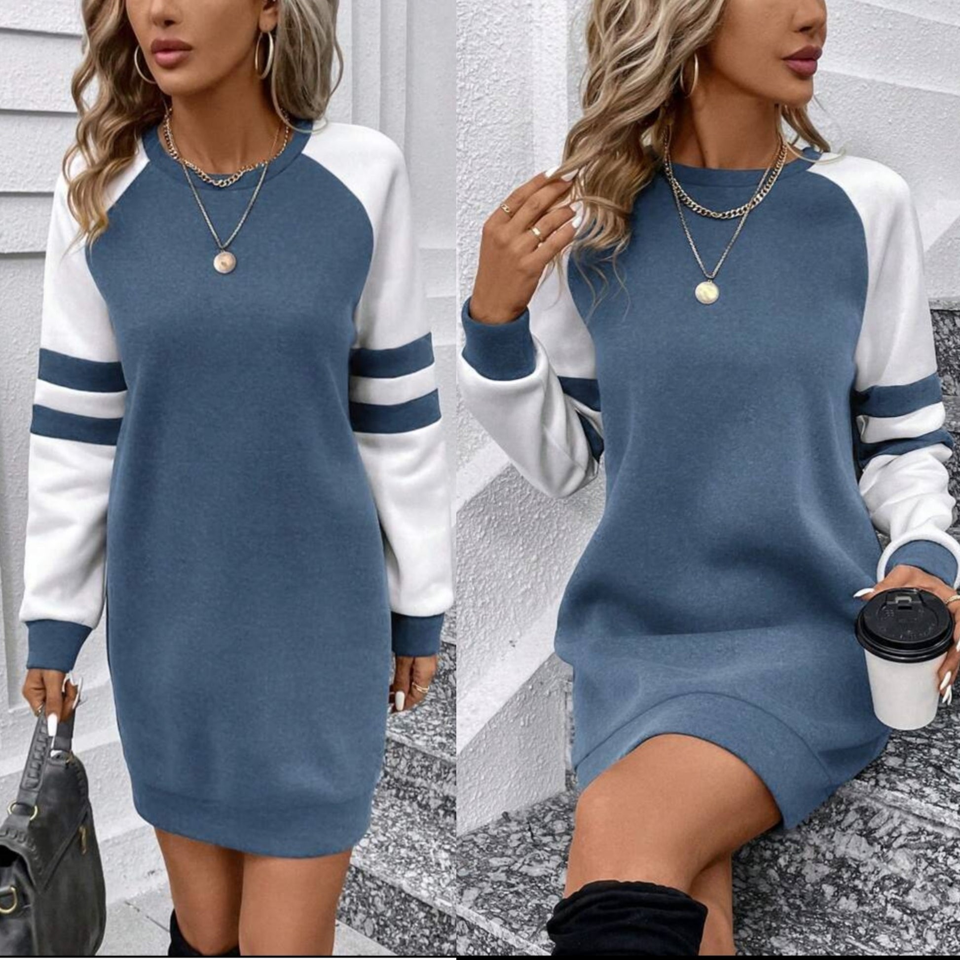 Модель має класичну круглу горловину та довгі рукави "реглан". Довжина сукні підібрана так, щоб забезпечити комфорт у русі, але не показати нічого зайвого.