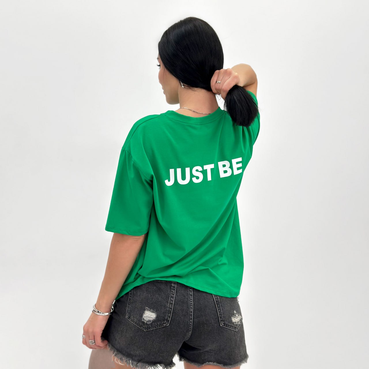 На особливу увагу заслуговує яскраво-зелений колір футболки, який не тільки виділяє модницю з натовпу, а й додає відчуття свіжості та новизни образу.