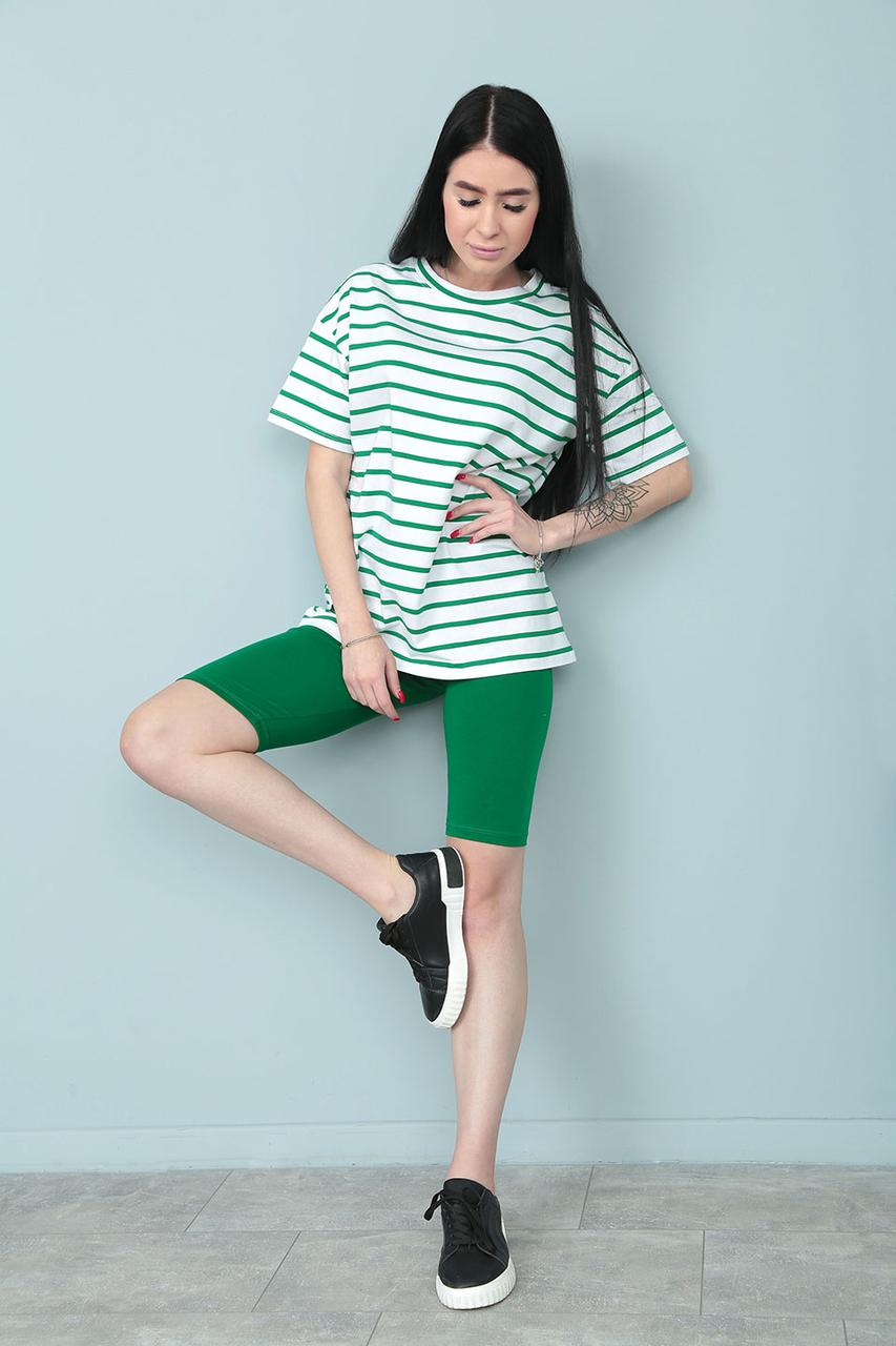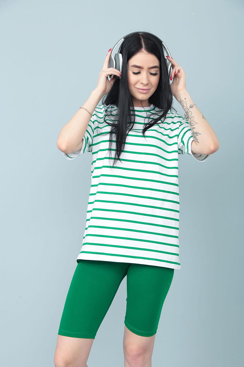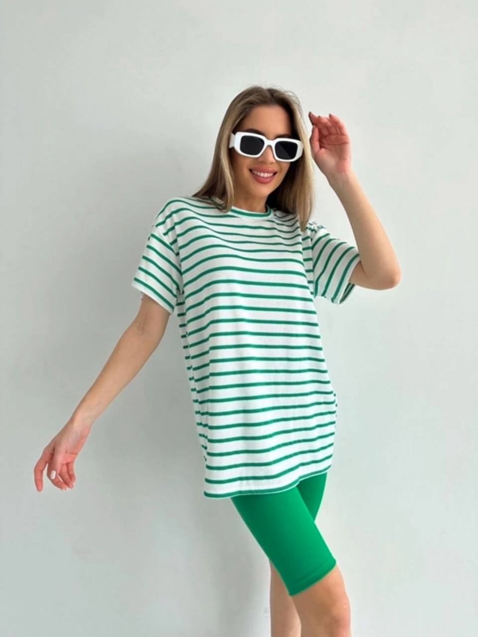- - футболка з принтом у горизонтальну смужку, однотонні велосипедки;
