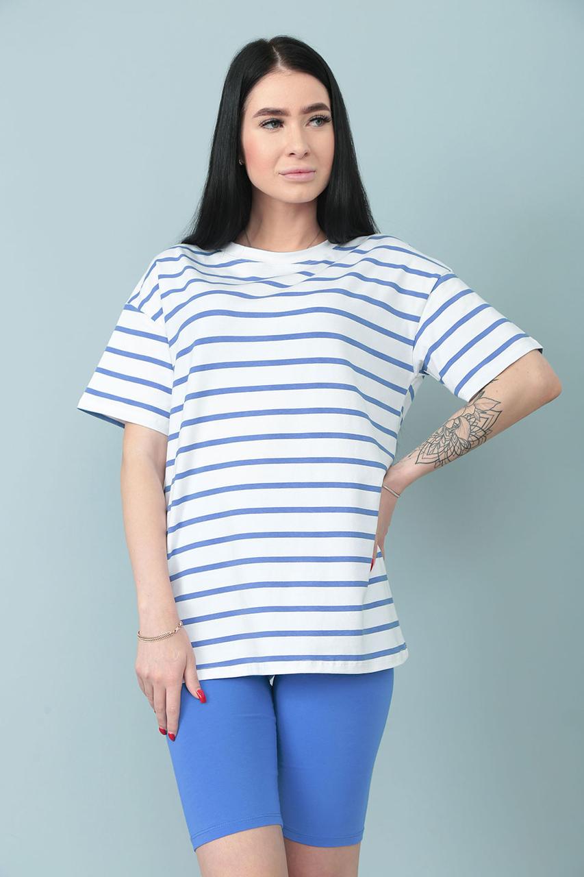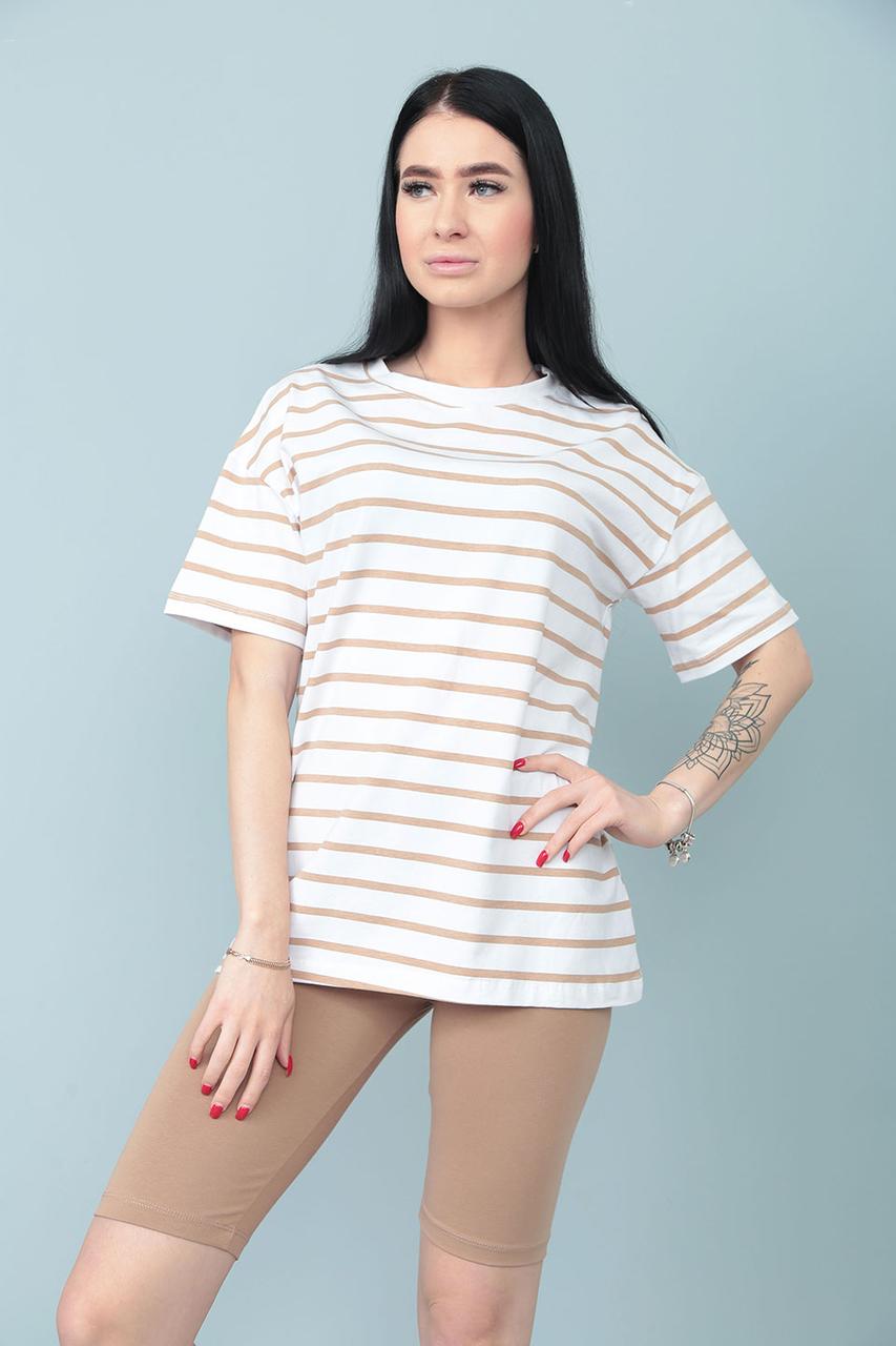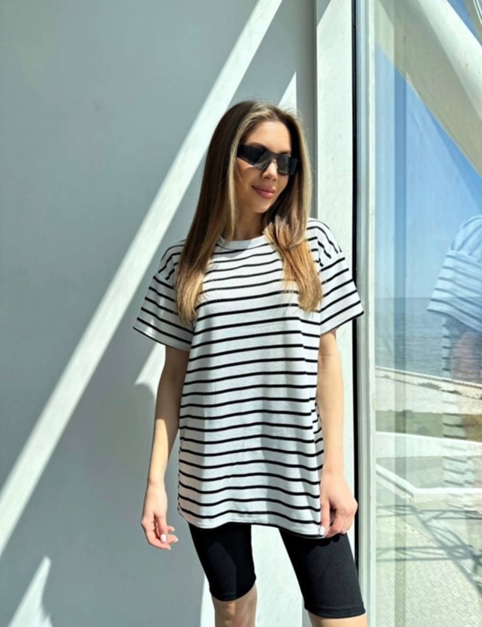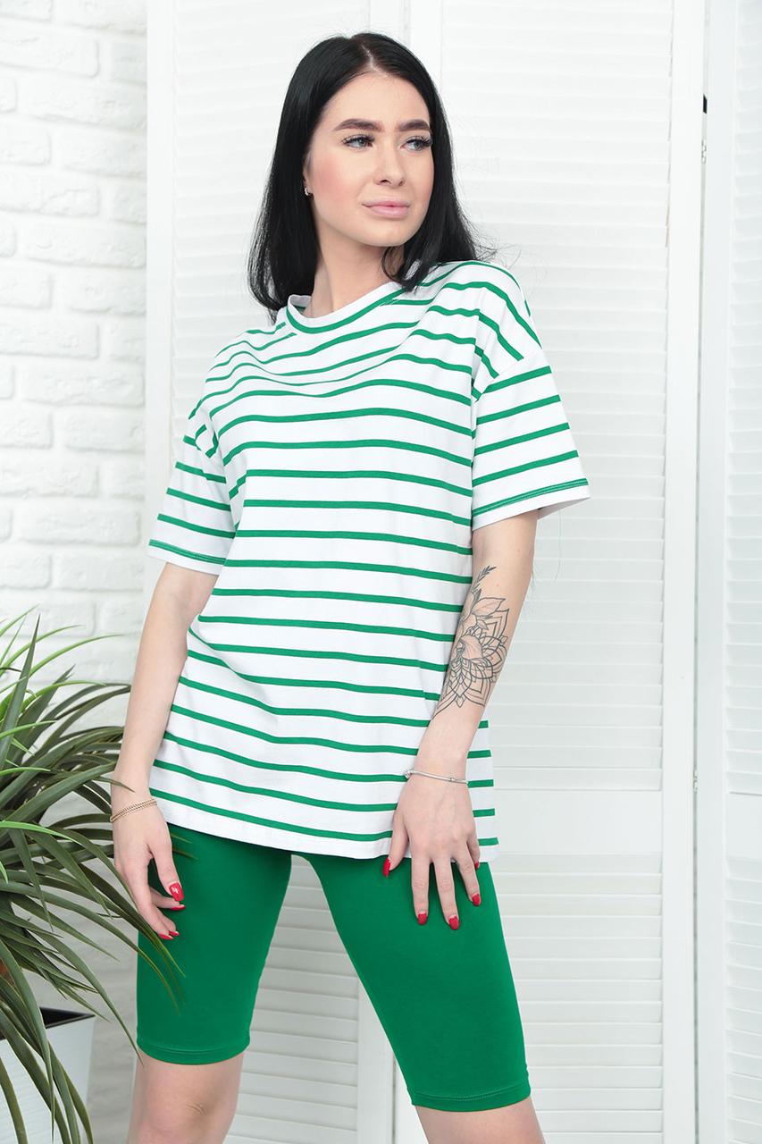 - - футболка з принтом у горизонтальну смужку, однотонні велосипедки;