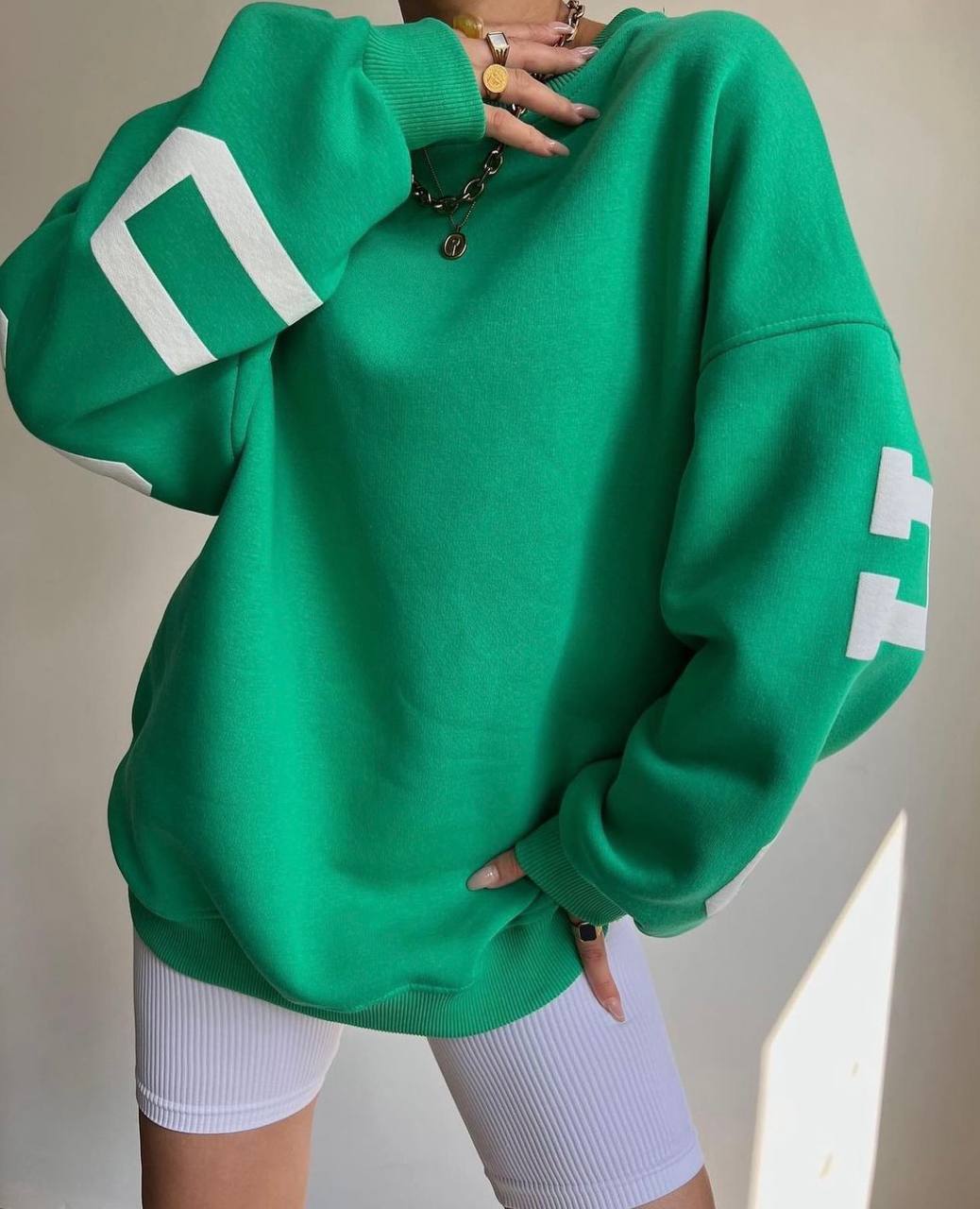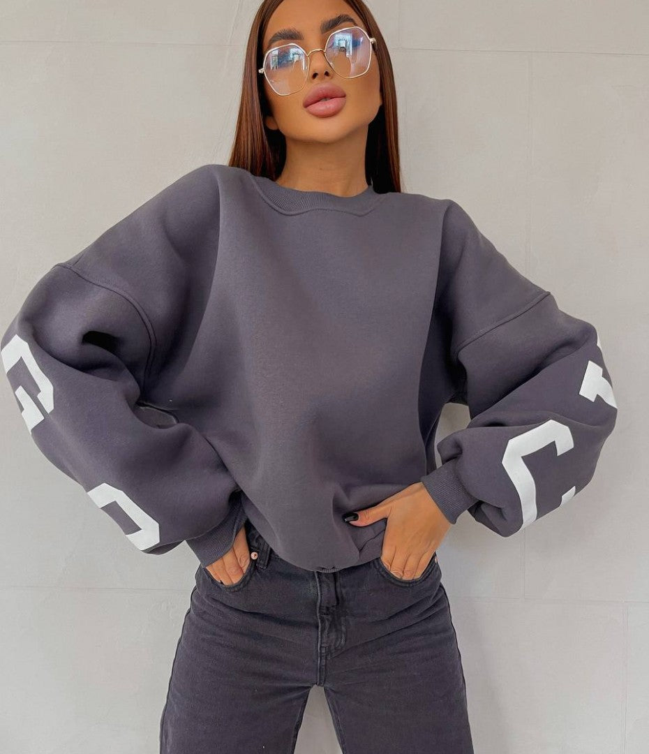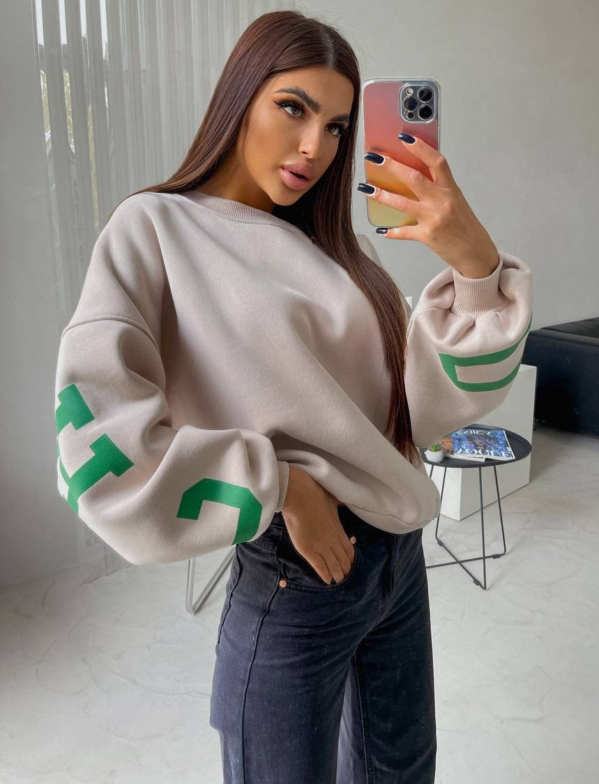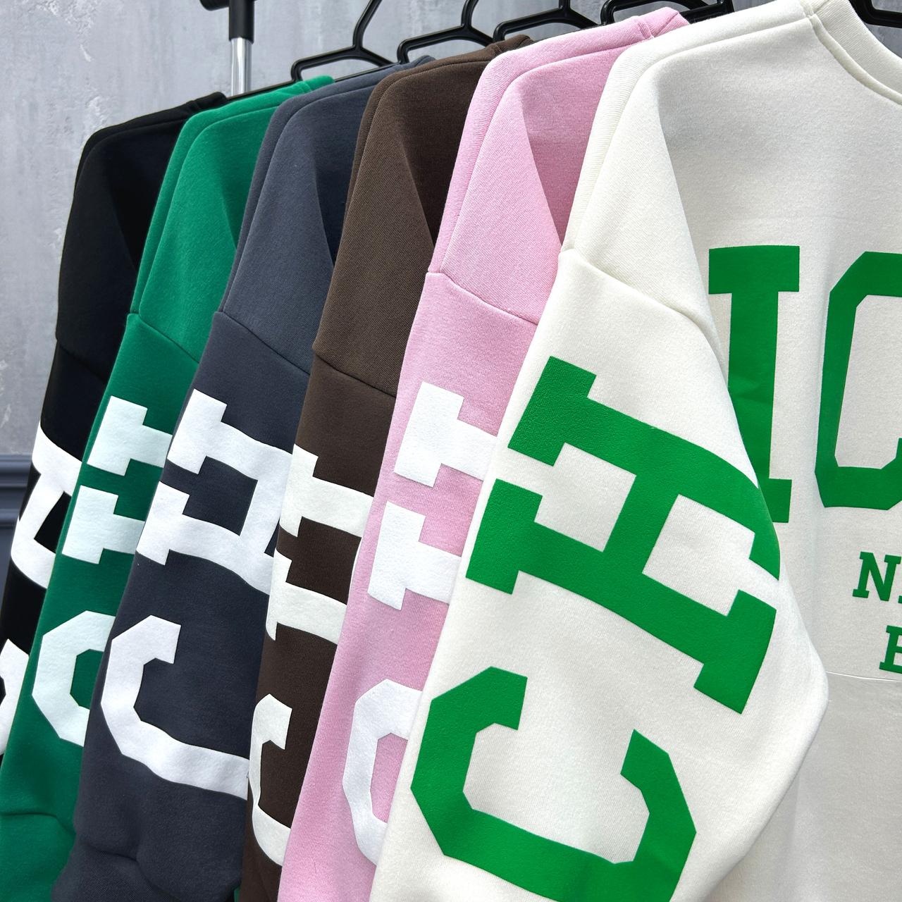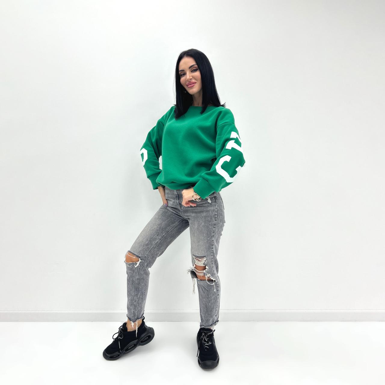 Модель пошита у 6 кольорах. Кожна модниця зможе обрати свої ідеальні відтянки, які будуть відповідати її стилю та настрою. Але родзинка моделі – накатка. Саме крупний напис з крутим шрифтом зробить образ помітним та елегантним.