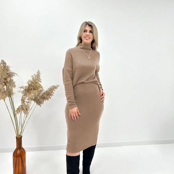 Вишуканий комплект, виконаний у базовому кольорі мокко, складається з гольфа з високим коміром та міді спідниці.
