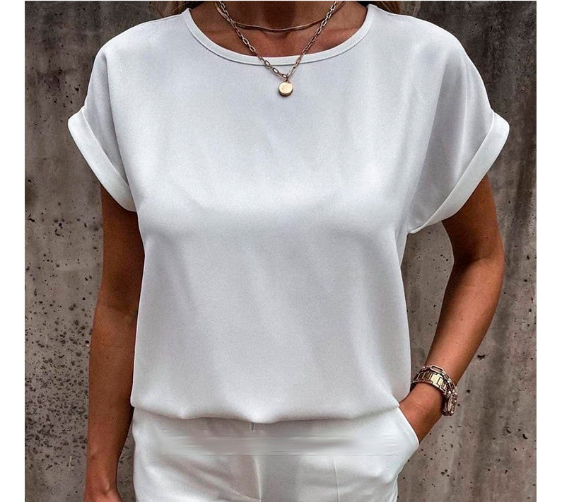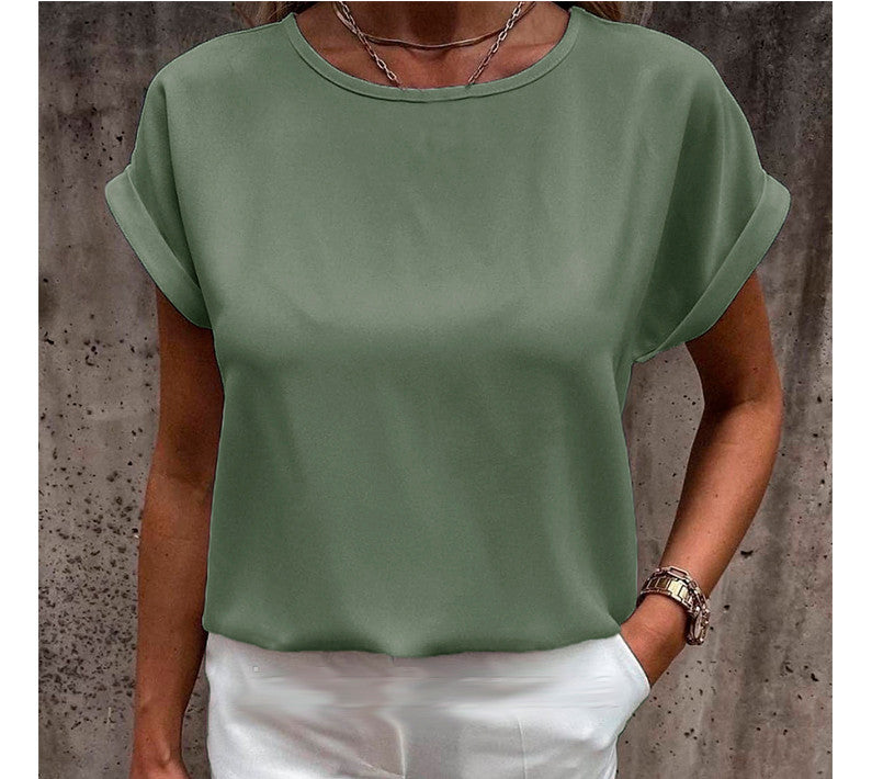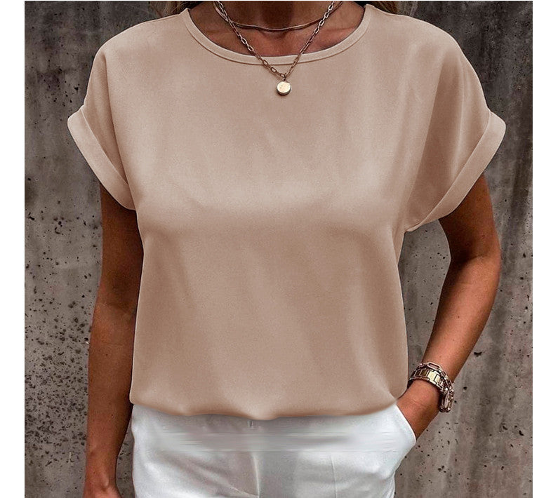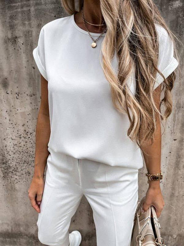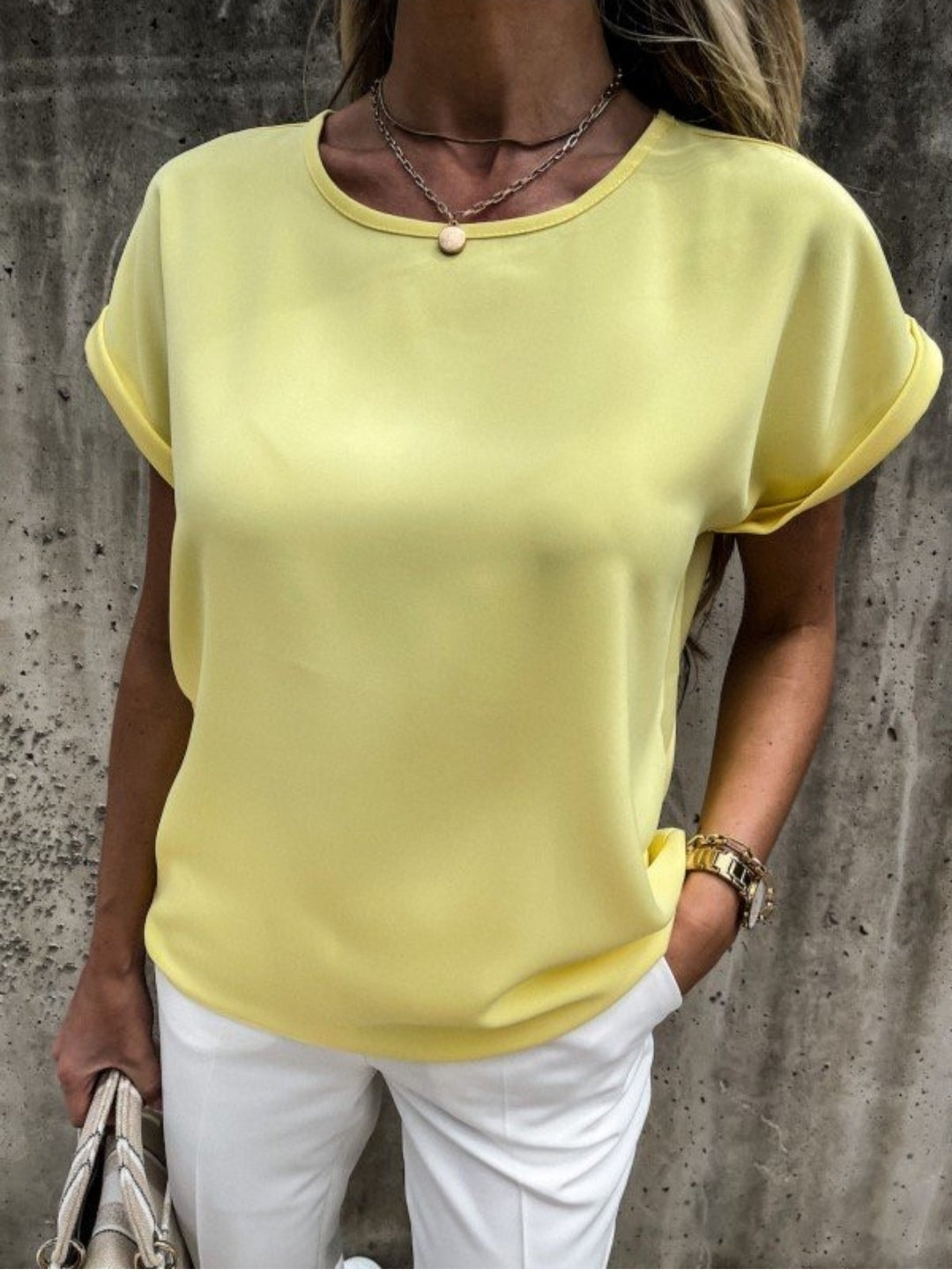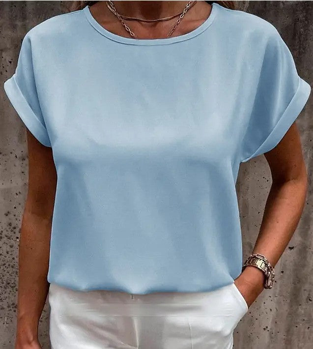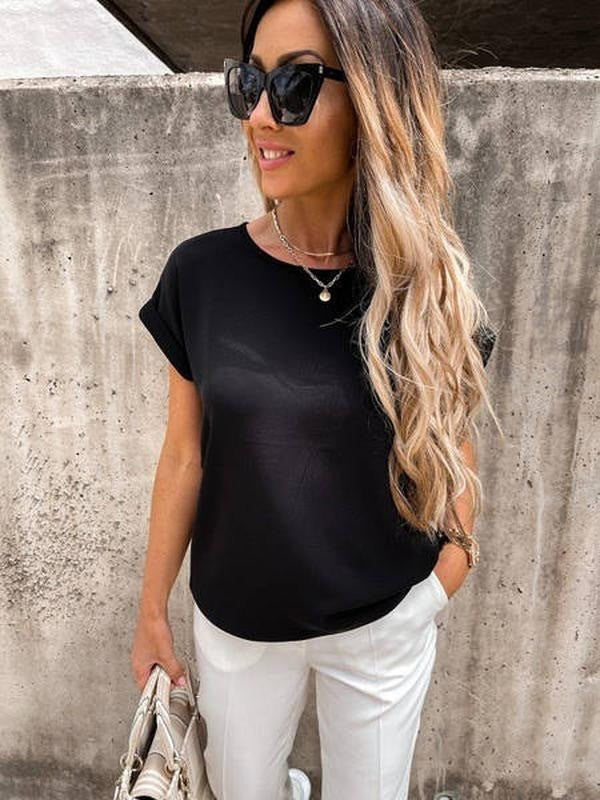 Літні блузки і футболки вільного крою – універсальний елемент сучасного гардероба дівчат. Модель має овальний неглибокий виріз горловини, він не робить гучного акценту на зоні декольте, але візуально подовжує шию. Короткі рукави-кімоно з вилогами прикривають плечі і надають образу елегантності.