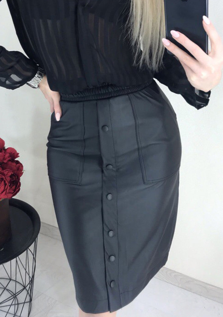 Стильна шкіряна спідниця модного фасону "олівець" має завищену талію з поясом на резинці. Завдяки високій посадці, виріб створює гарний стрункий силует вигідно підкреслює округлість стегон. Спереду розташовані дві зручні кишені і поличка-обманка з кнопками (не розстібаються).