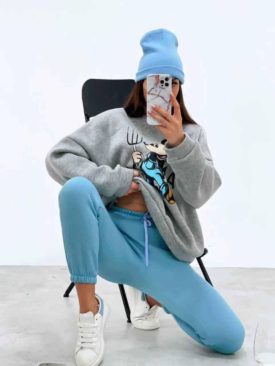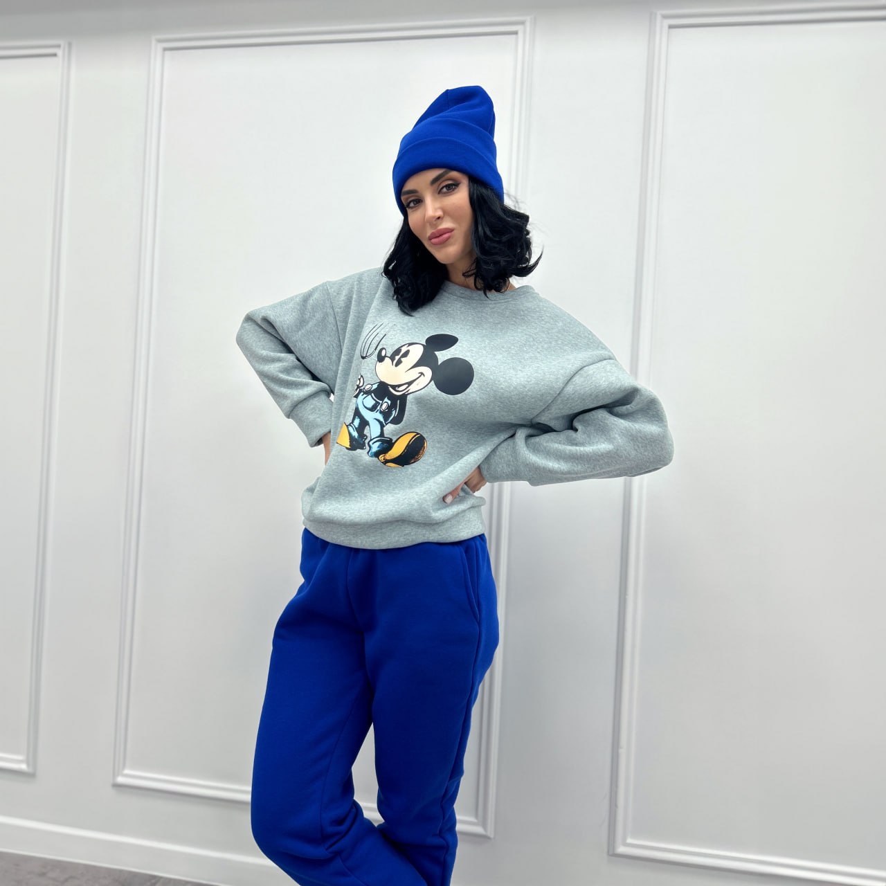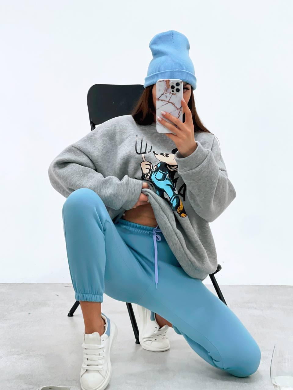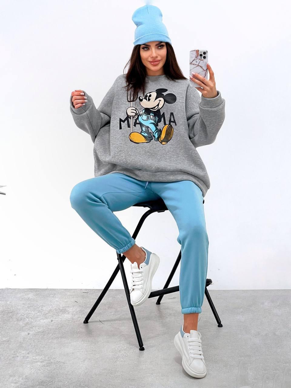 Особливості моделі Жіночий костюм-двійка "Minnie" складається з вільного худі та спортивних штанів. Верх комплекту виконаний із меланжевої сірої тканини, яка чудово поєднується з принтом та контрастує з яскравими однотонними штанами.