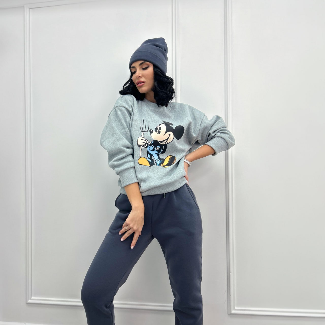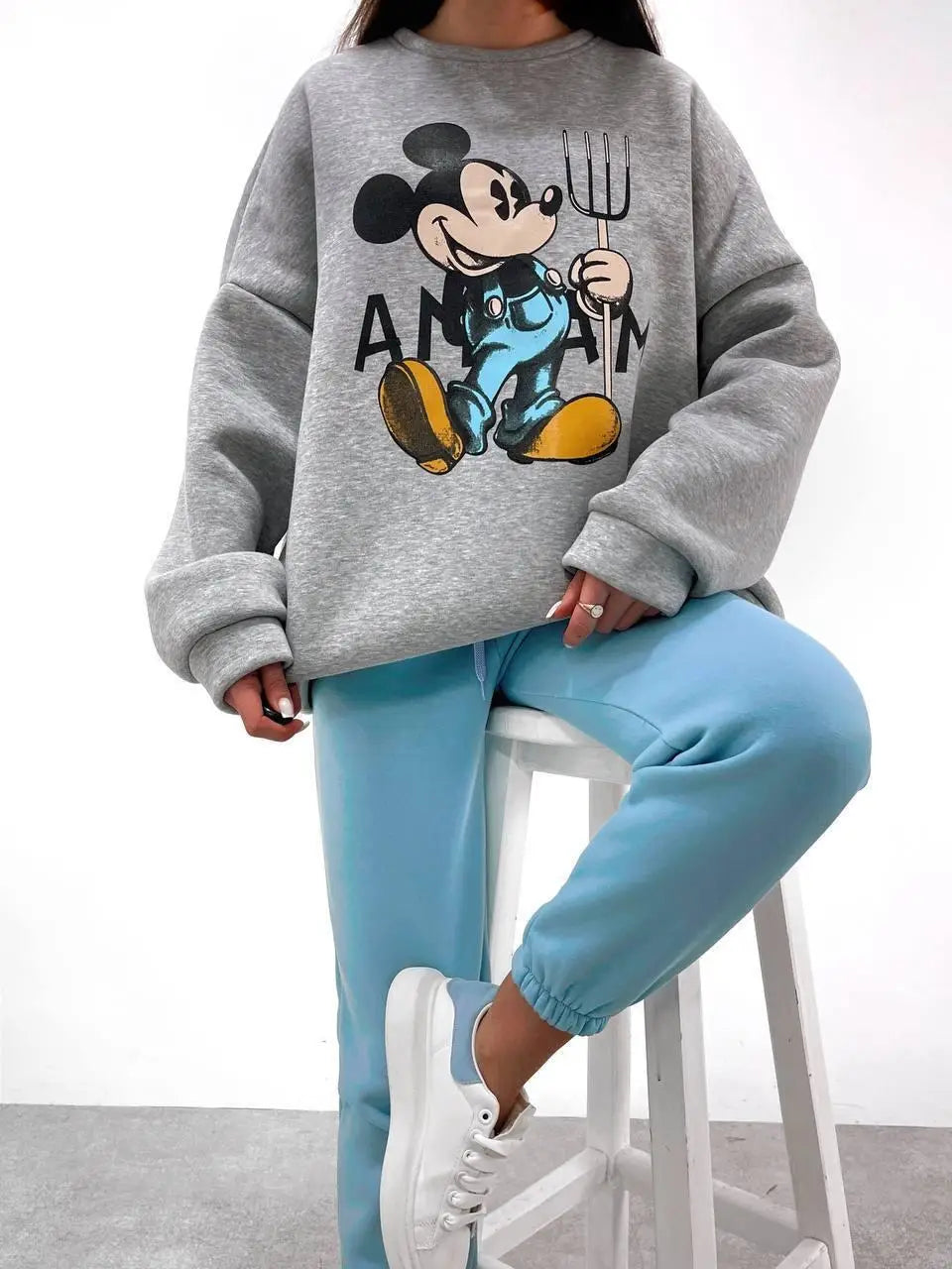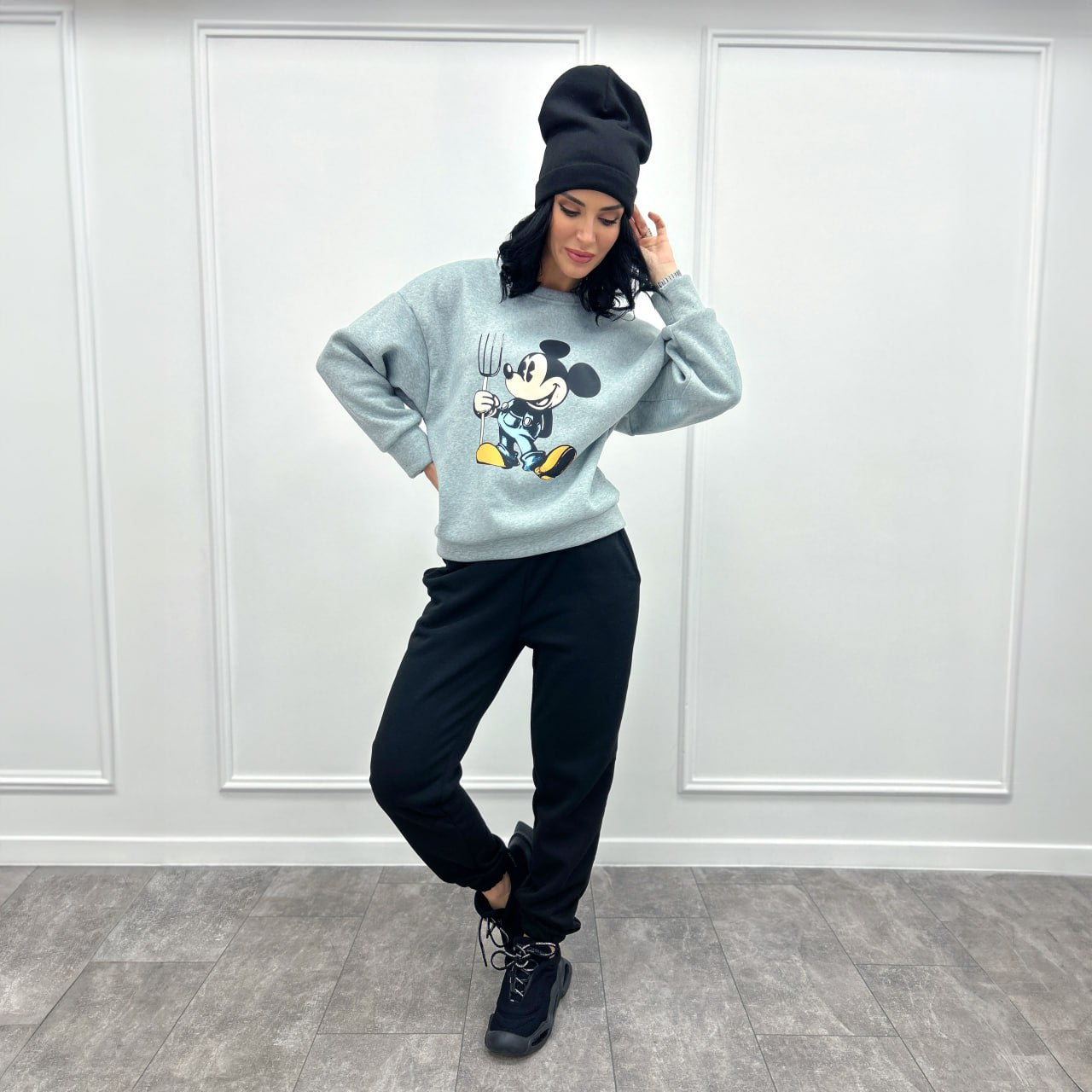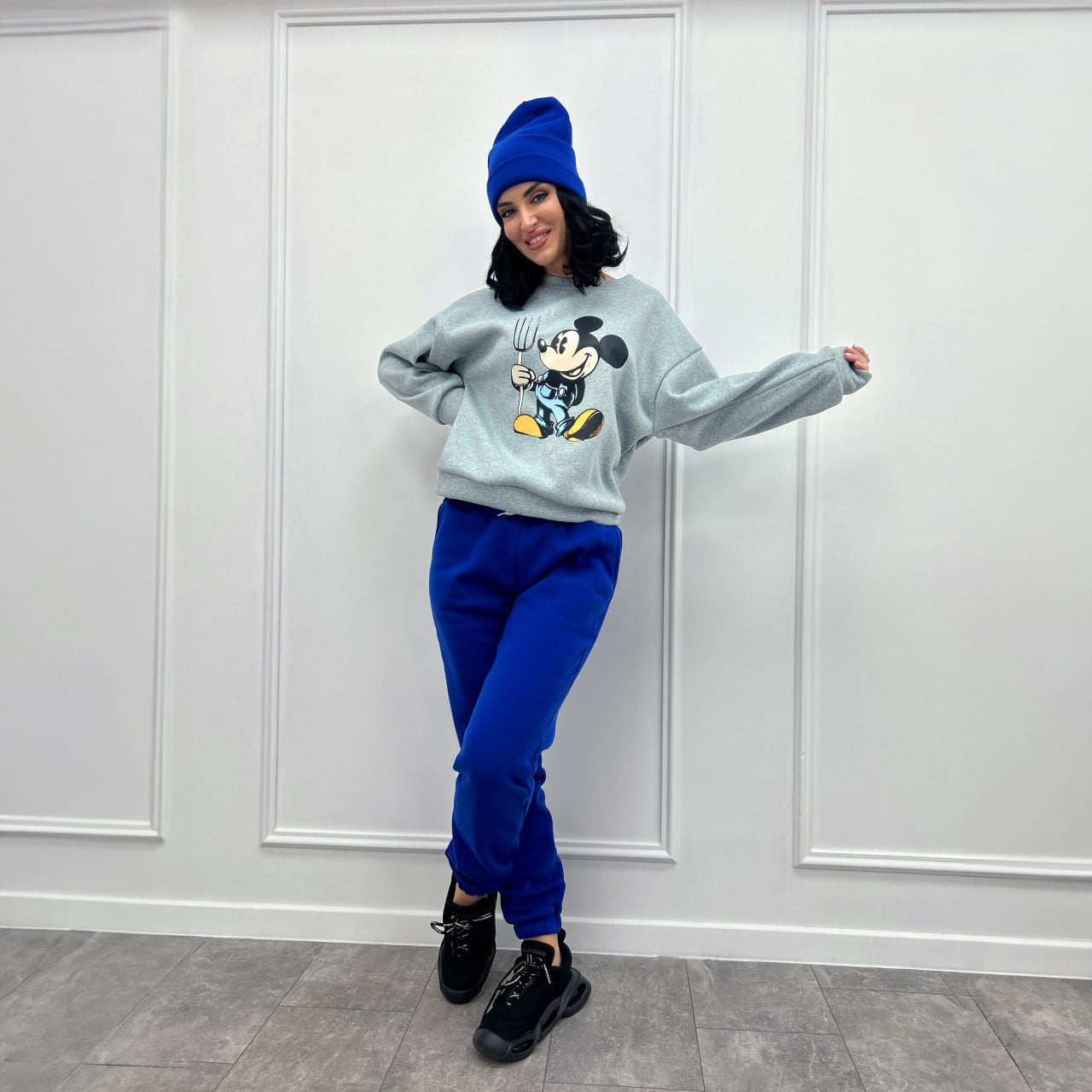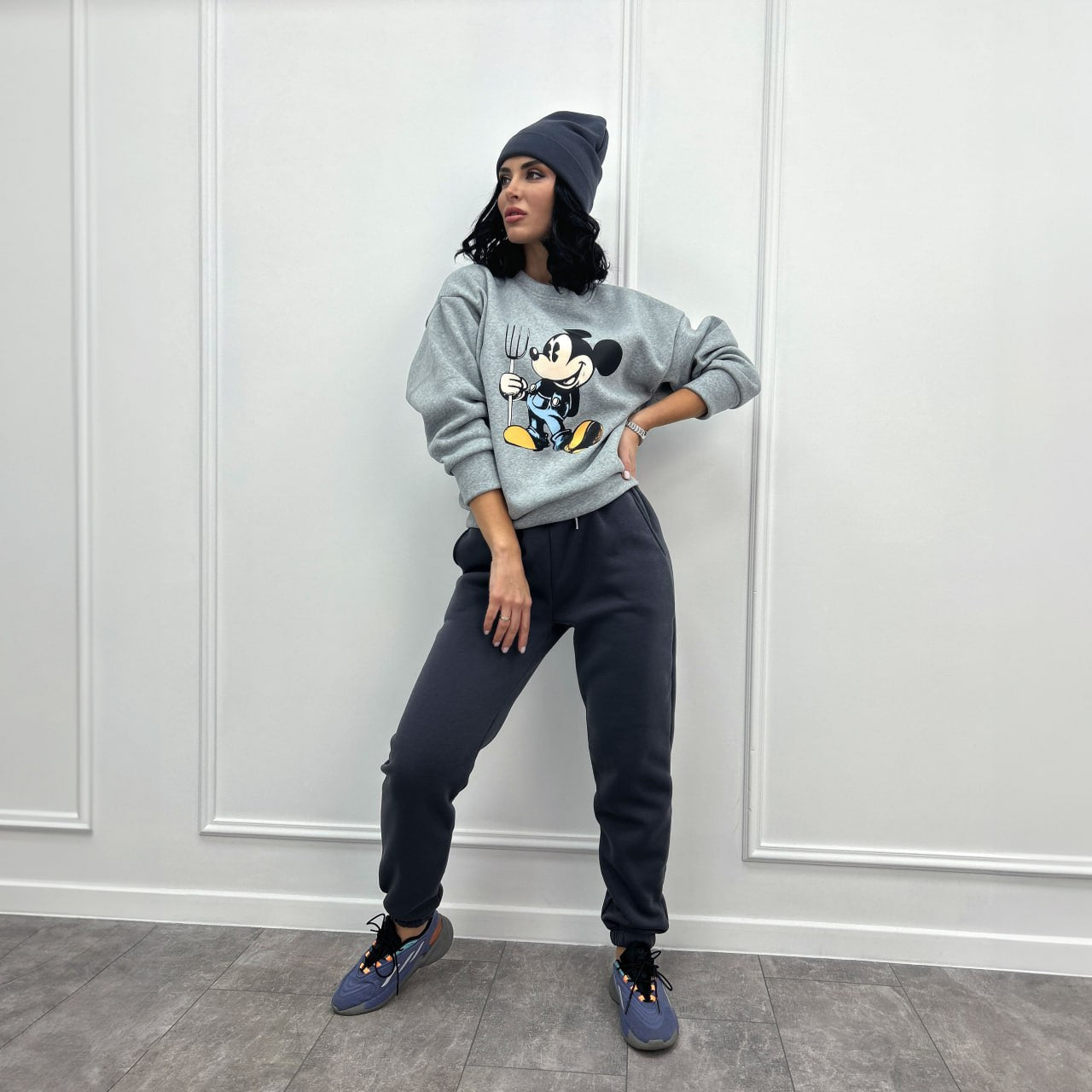 Особливості моделі Жіночий костюм-двійка "Minnie" складається з вільного худі та спортивних штанів. Верх комплекту виконаний із меланжевої сірої тканини, яка чудово поєднується з принтом та контрастує з яскравими однотонними штанами.