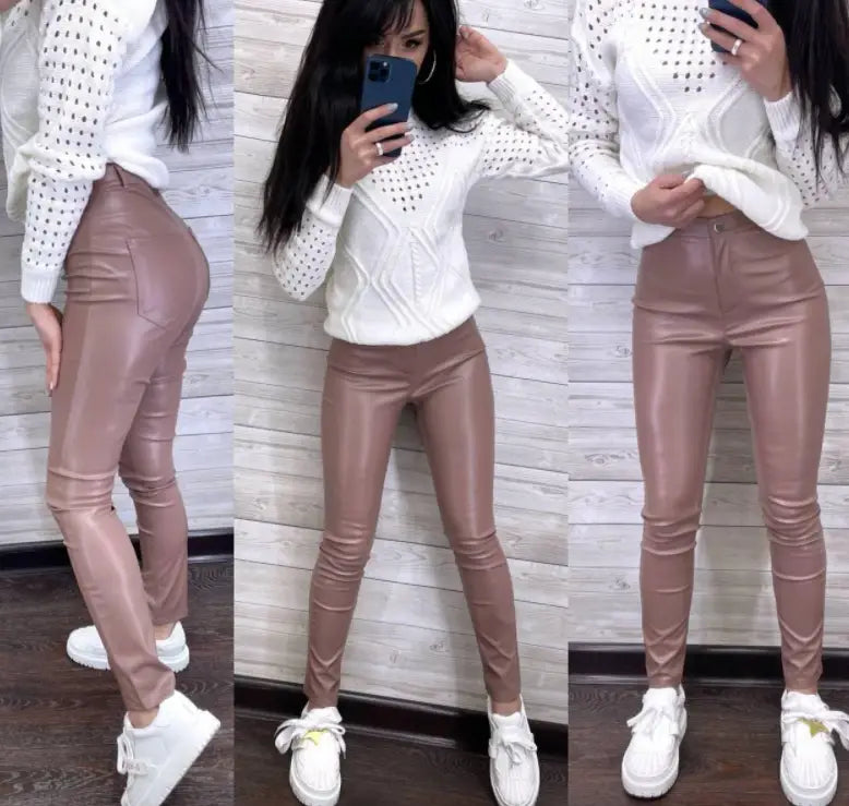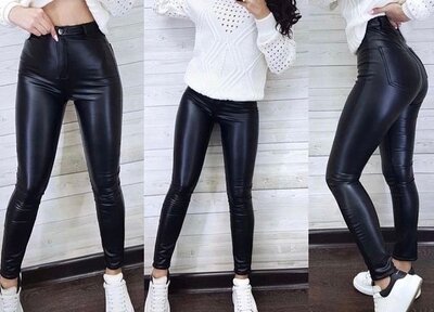 Завдяки облегающему фасоном, шкіряні штани вигідно підкреслюють всі достоїнства фігури і підсилюють привабливість. Стандартна довжина по щиколотку візуально витягує ноги, а висока посадка ефектно виділяє лінію талії і робить сексуальний акцент на стегна і сідниці. Модель спереду застібається на блискавку, а ззаду два накладних кишені.