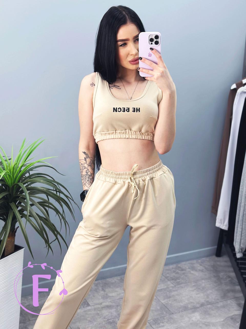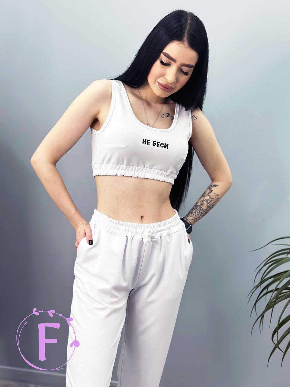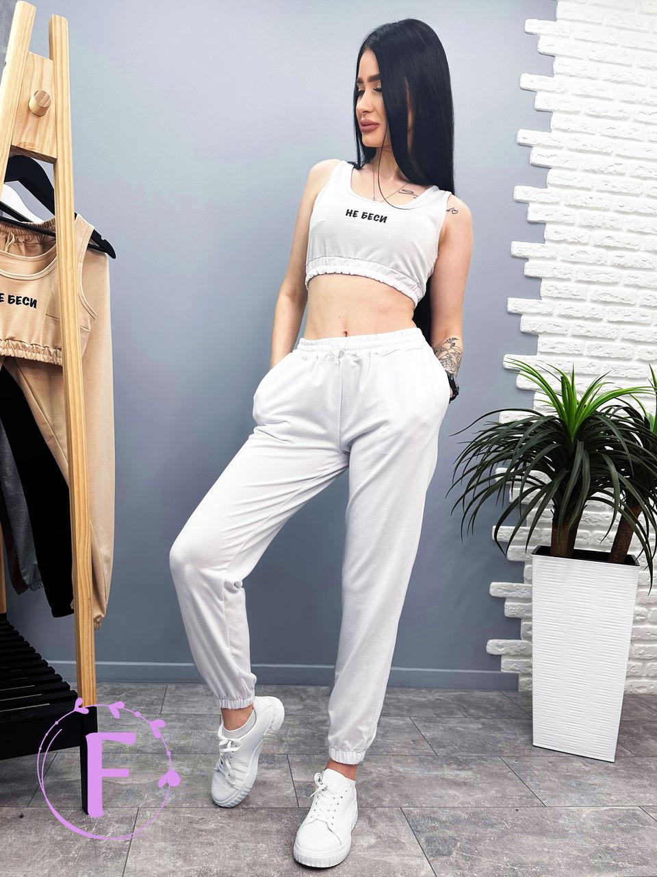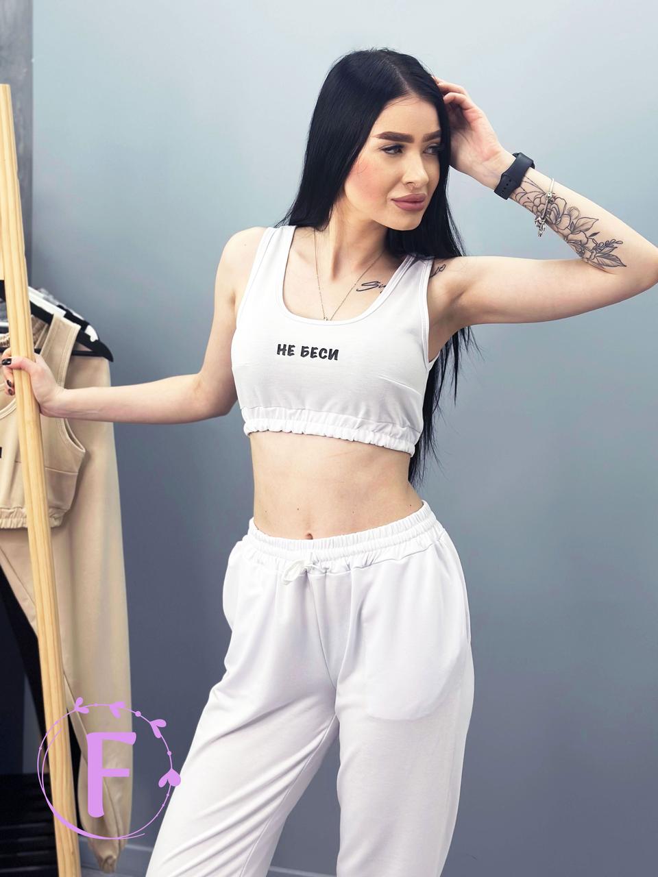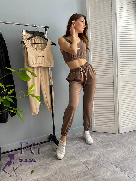 До легкого трикотажного костюма входять топік і спортивні джогери. Штани з кишенями і поясом на резинці відмінно сідають по фігурі. Вільний фасон і зручна посадка забезпечують комфортне носіння і не обмежують рухів. Топ з витачками на грудях і резинкою знизу дозволяє продемонструвати животик. Така коротка маєчка вигідно підкреслює сексуальність і жіночність фігури. На грудях розташована невелика накатка, яка витримує багаторазове прання, стійка до температур.