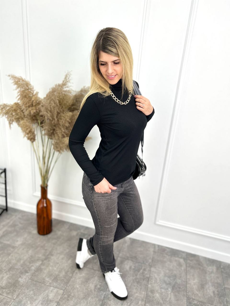 Базові гольфи та водолазки зручно облягають фігуру і відмінно поєднуються з будь-якими предметами гардеробу, будь то неформальні джинси або строгий діловий костюм. Високий комір не тільки надійно захищає горло від холоду, але й візуально подовжує шию, що дозволяє зробити силует більш жіночним та витонченим.