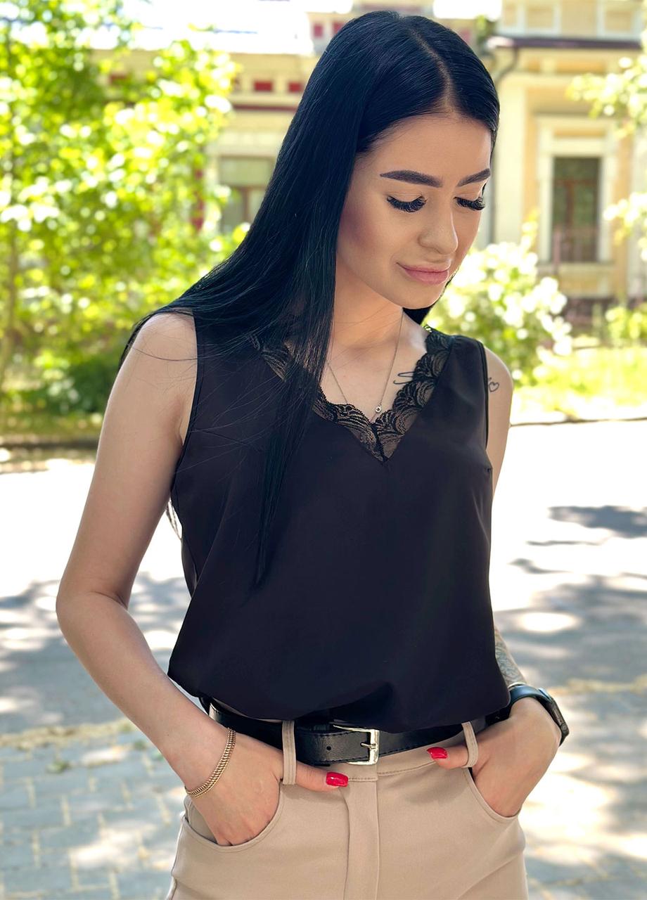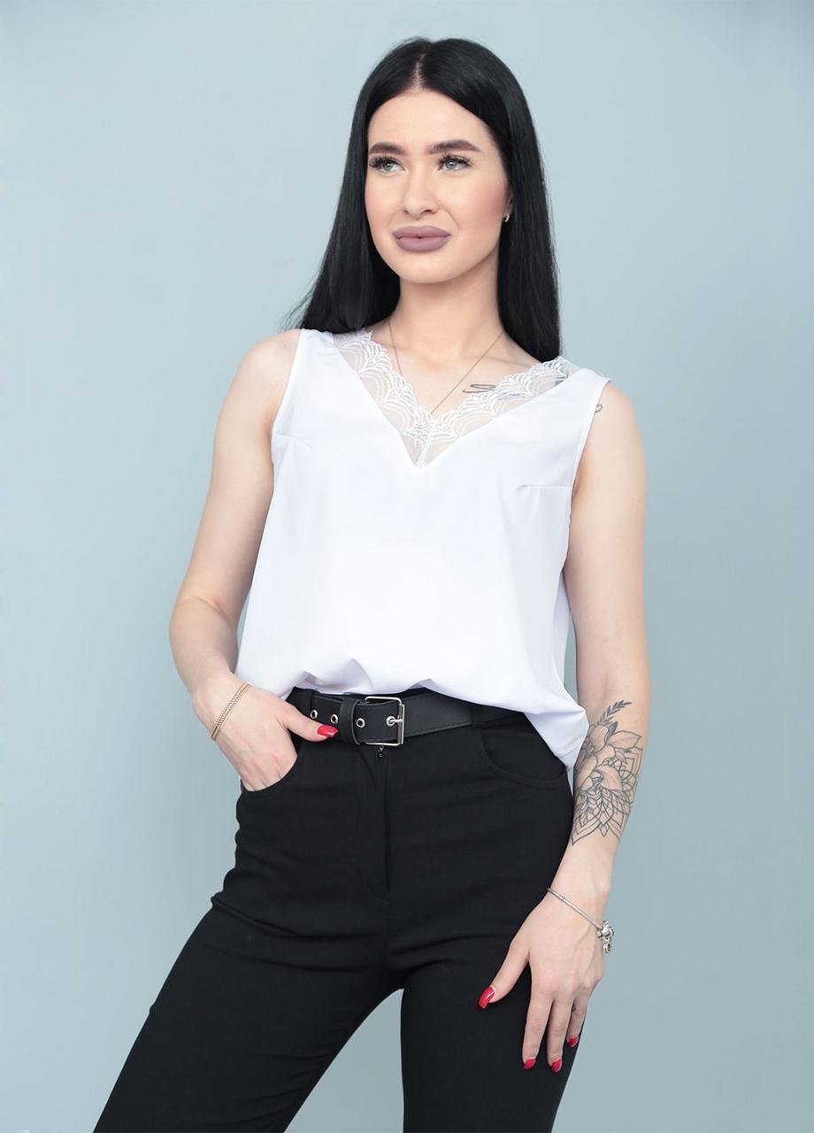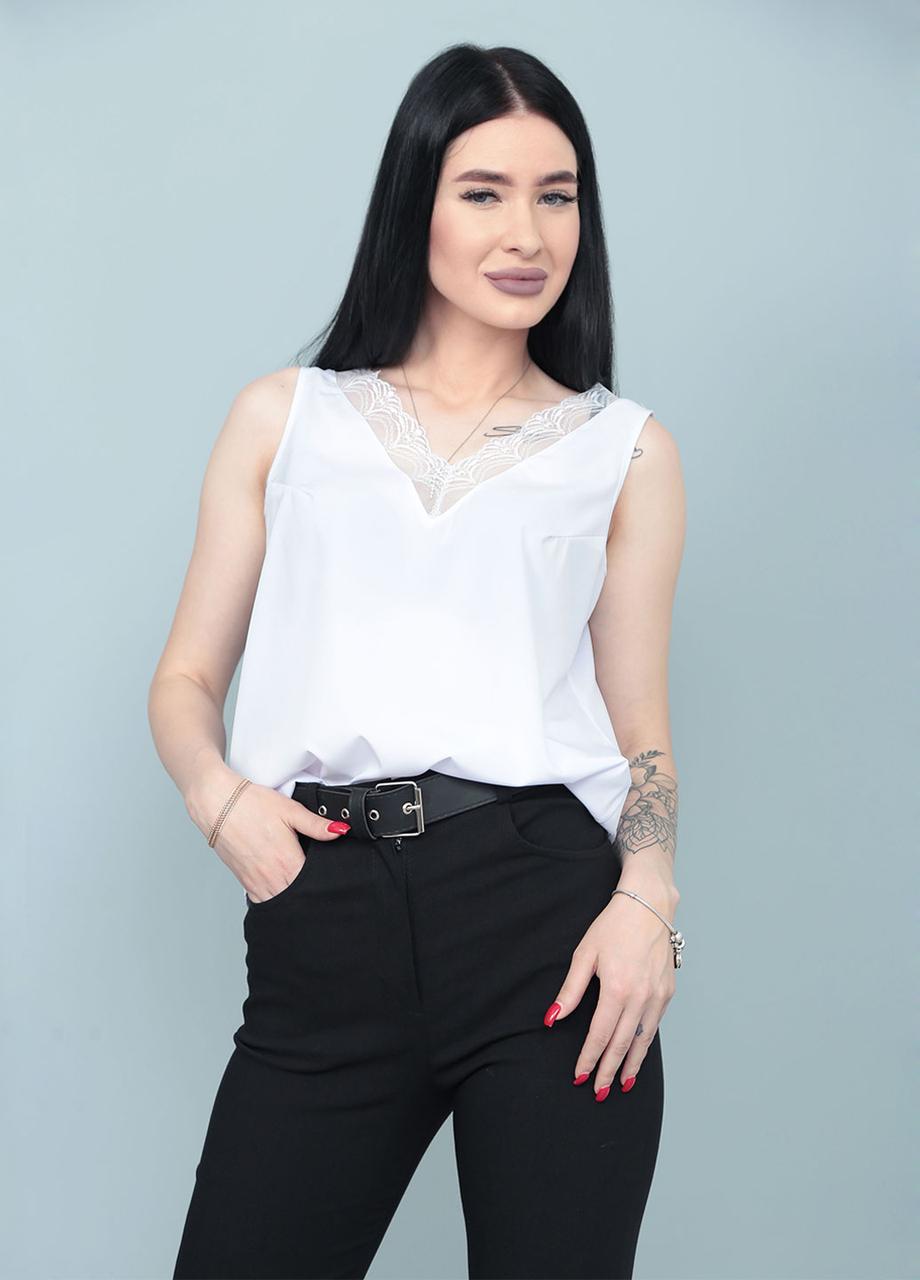 Блузка пошита у двох базових контрастних кольорах – чорному та білому. Відтінок мережива відповідає виробу, тому образ виходить цілісним та стриманим. Блузка без рукавів дозволяє почуватися комфортно навіть у спекотні дні, а мереживо та незвичайний крій допоможе зробити оригінальним найсуворіші ділові костюми.
