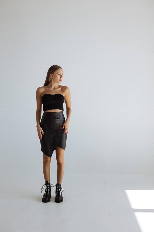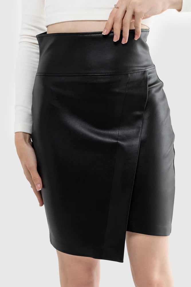 Жіноча спідниця виготовлена з м'якої матової екошкіри. Висока посадка вміло приховує недоліки фігури, робить її візуально стрункішою і витягує силует. Асиметричність крою дозволяє відкрити ніжки, додає образу ефектності і кокетства.