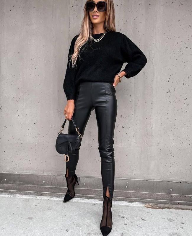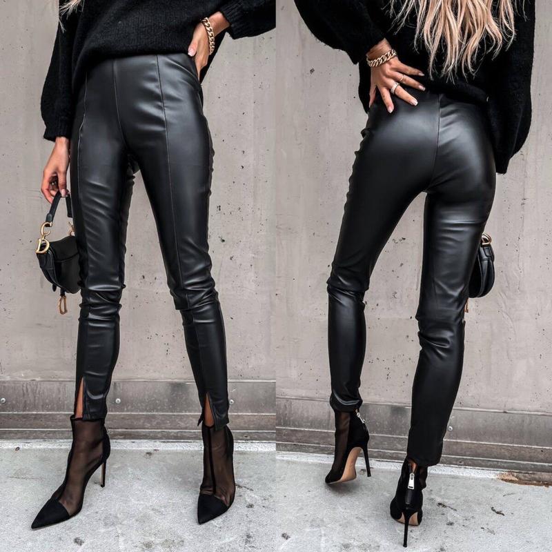 Еластичність екошкіри на флісі дозволяє виробу щільно облягати ніжки, не створюючи дискомфорту під час носіння. Завдяки завищеній талії і зручній посадці, шкіряні штани, що облягають, красиво сидять на фігурі, вигідно підкреслюючи форми. Рядки вздовж штанин візуально роблять ніжки довшими і витягують силует, а розрізи на штанинах знизу надають образу оригінальності та стилю. Застібаються шкіряні штани на потаємну блискавку збоку.
