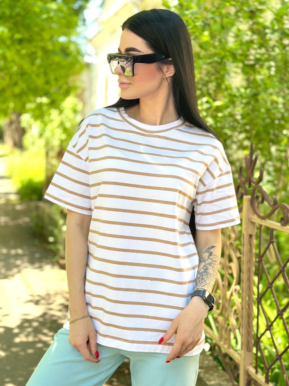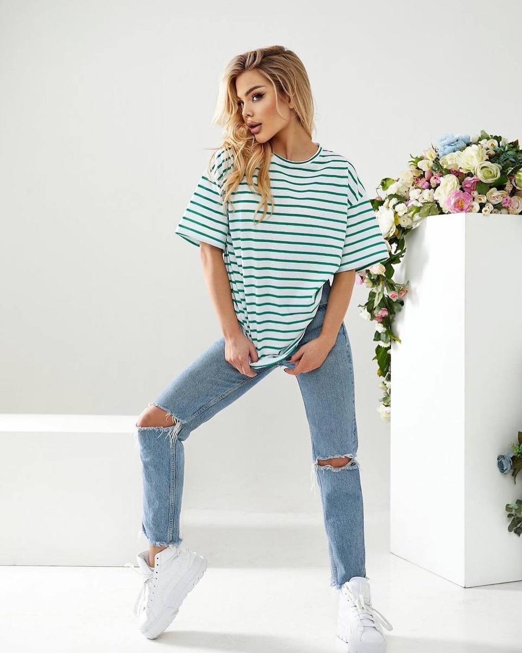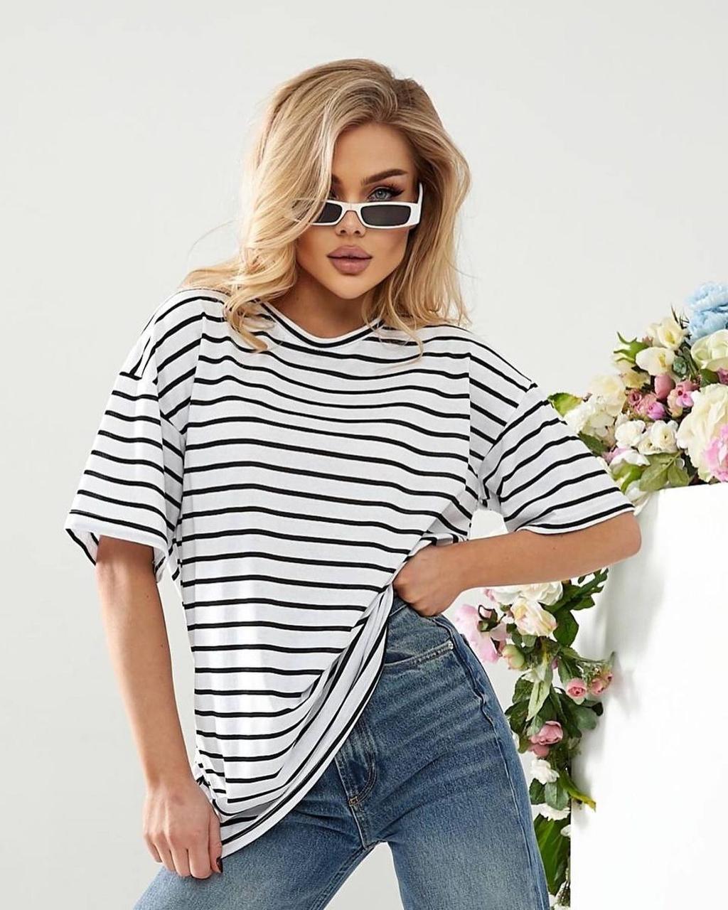 Подовжена смугаста футболка – універсальна модель. Її можна носити із шортами, широкими або звуженими джинсами, лосинами чи брюками. Така футболка чудово підійде як для прогулянки чи поїздки на відпочинок, так і для звичайного робочого дня: завдяки спокійній палітрі образ не виглядатиме зухвало.
