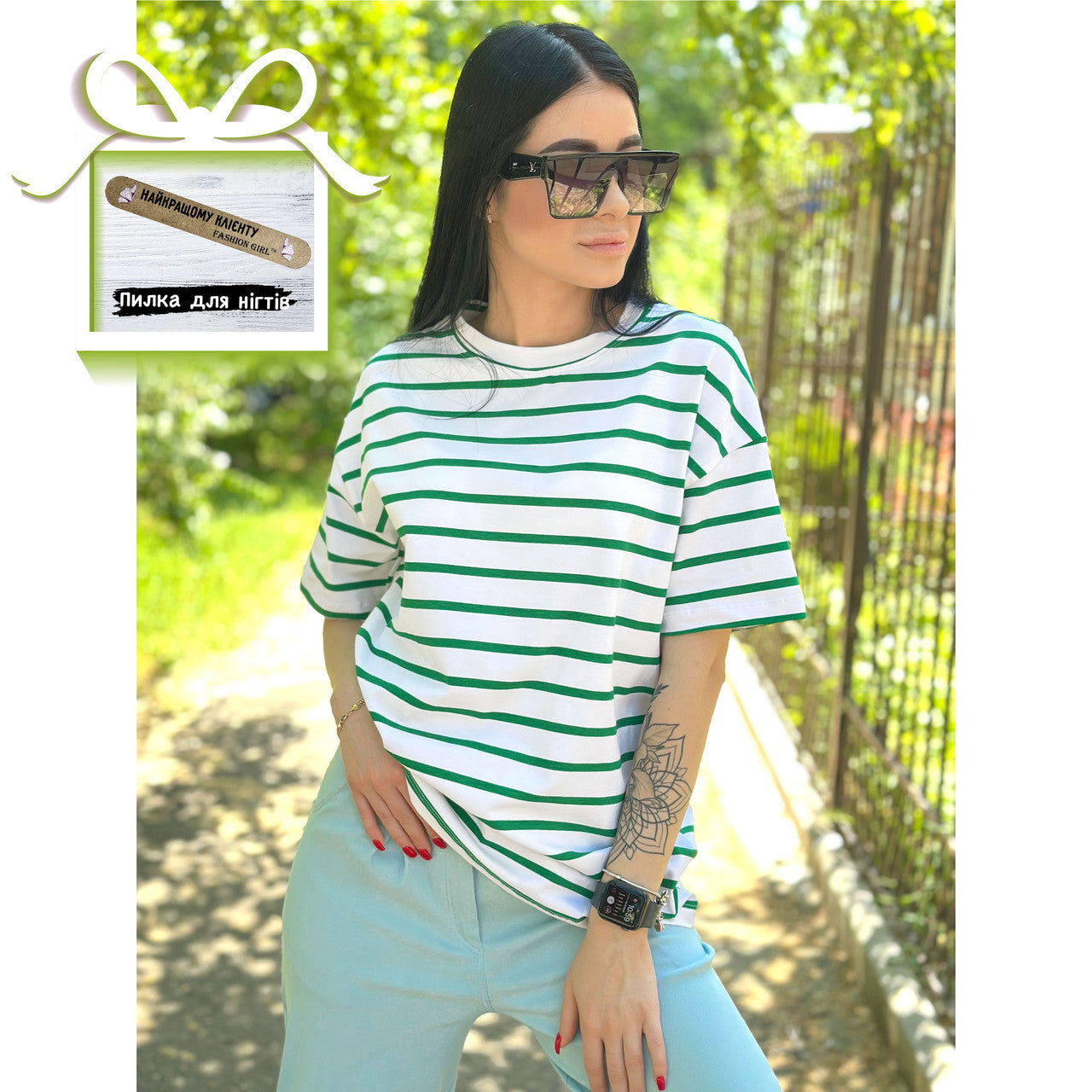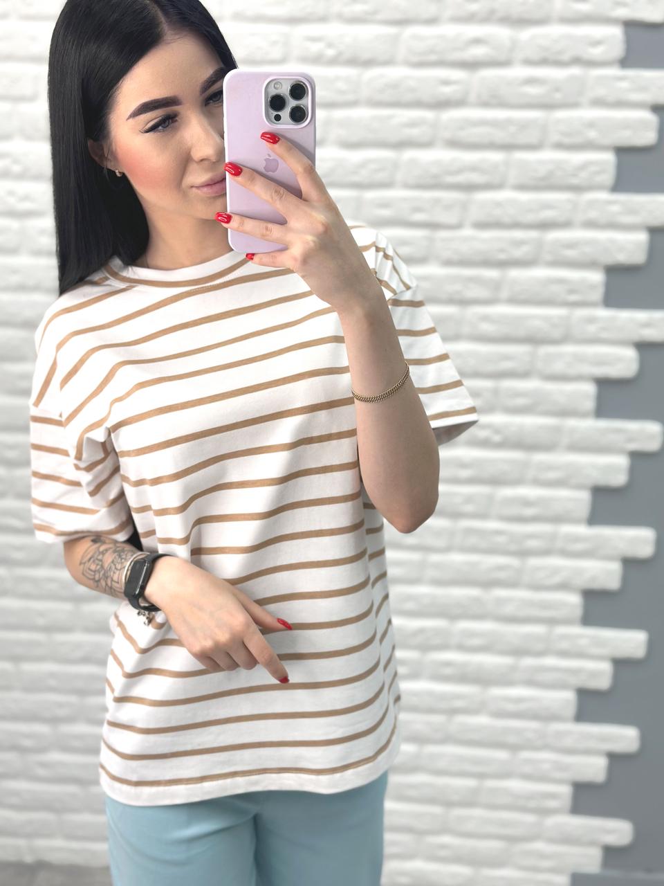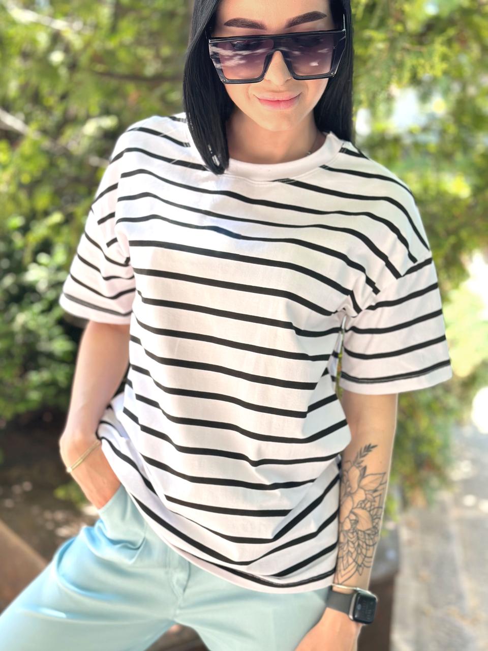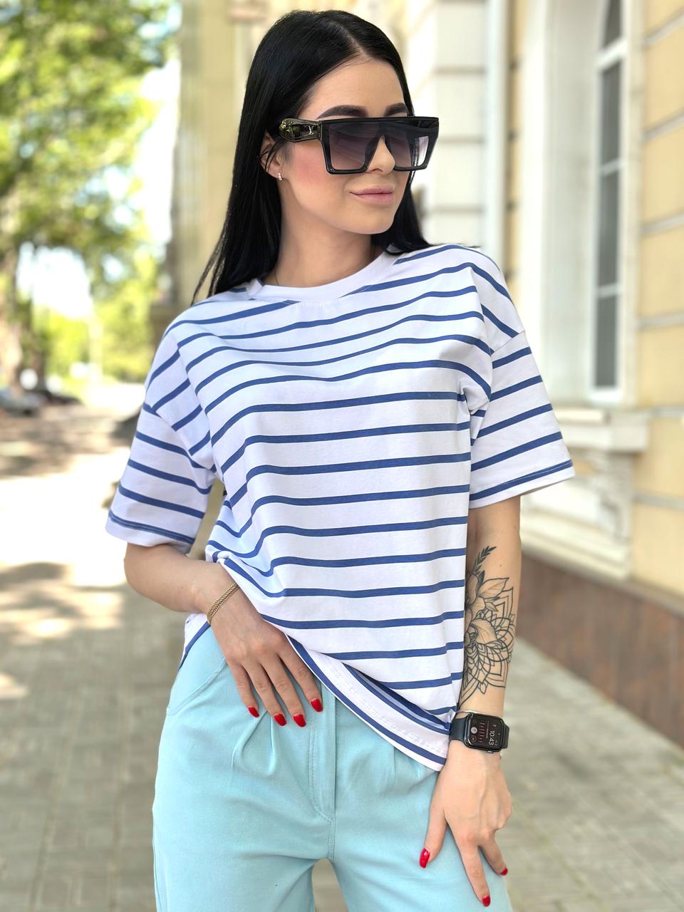 Подовжена смугаста футболка – універсальна модель. Її можна носити із шортами, широкими або звуженими джинсами, лосинами чи брюками. Така футболка чудово підійде як для прогулянки чи поїздки на відпочинок, так і для звичайного робочого дня: завдяки спокійній палітрі образ не виглядатиме зухвало.
